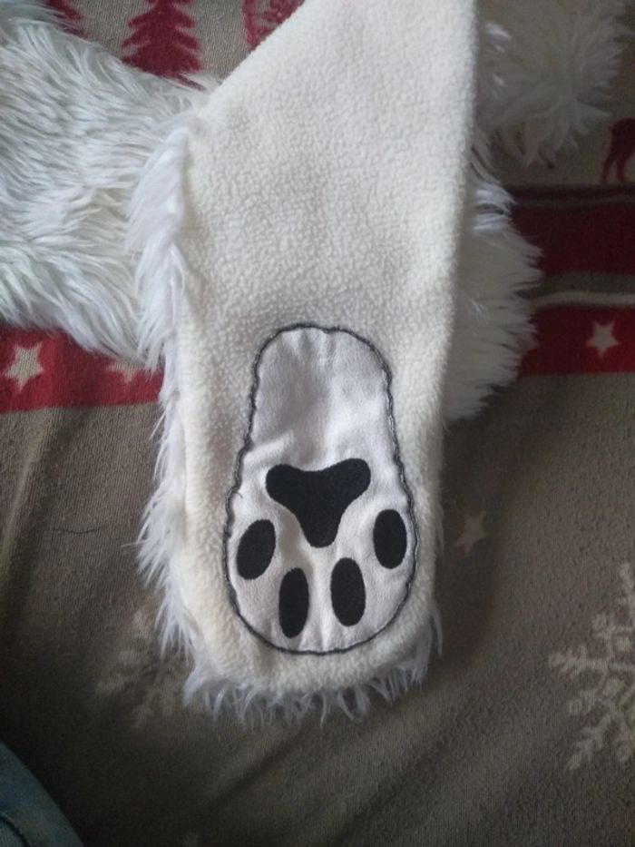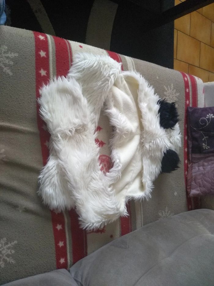 Bonnet 4 en 1, bonnet, protège oreilles, écharpe et gants. Le tout motif chien