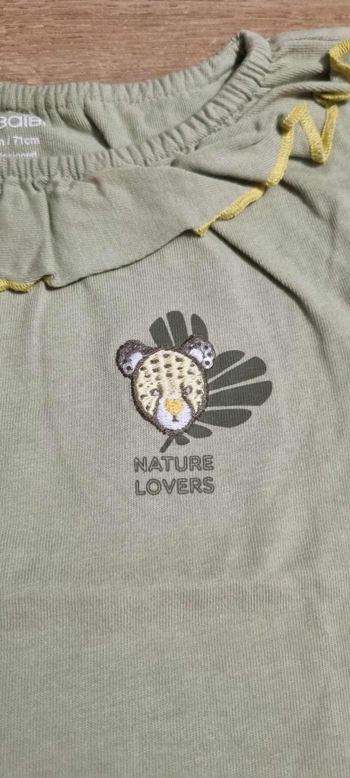 T-shirt à manches courtes kaki avec col volant, motif tête de léopard Obaïbi taille 9 mois Neuf, jamais porté