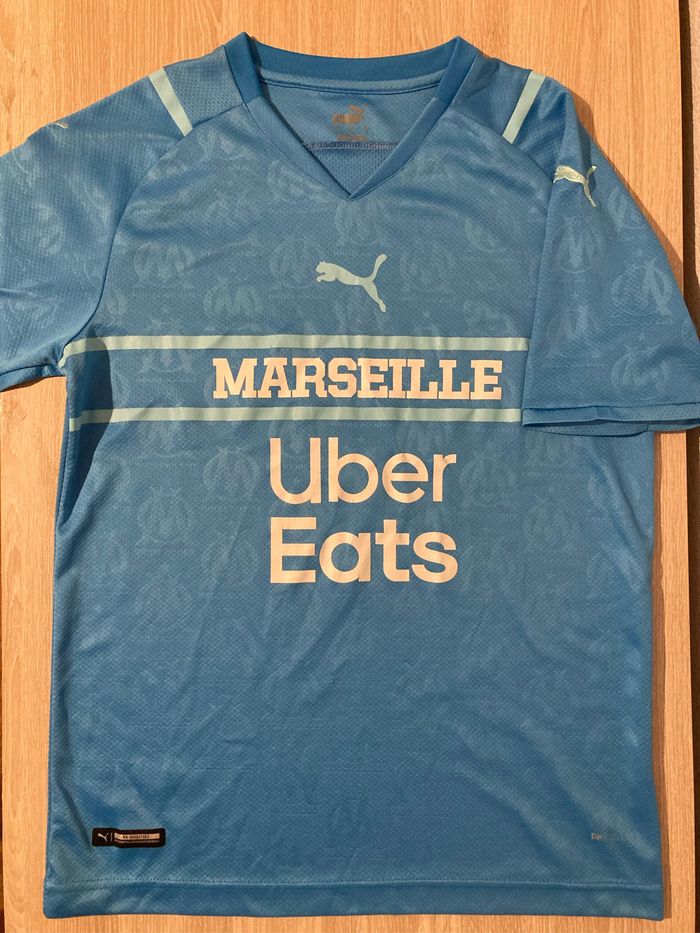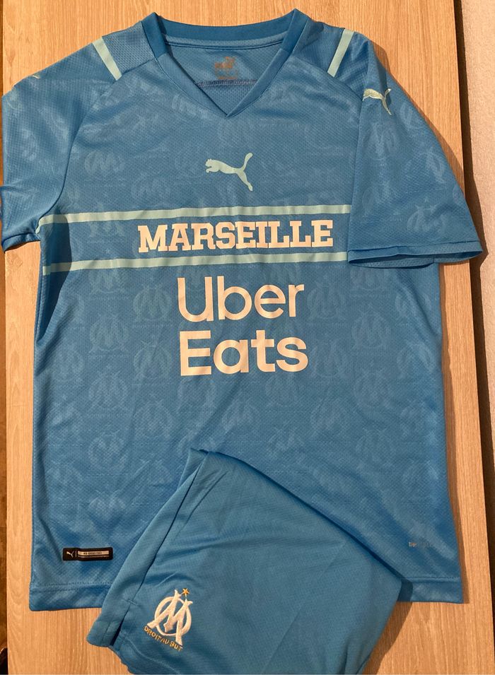 Ensemble Maillot + short de foot OM olympique de Marseille bleu ciel version supporter Taille S Coupe droite largeur 50 cm longueur 69 cm Matière stretch tissu alvéolé Logo et écusson brodés Lavé, Plié et emballé sous plastique Envoi sous 12h max