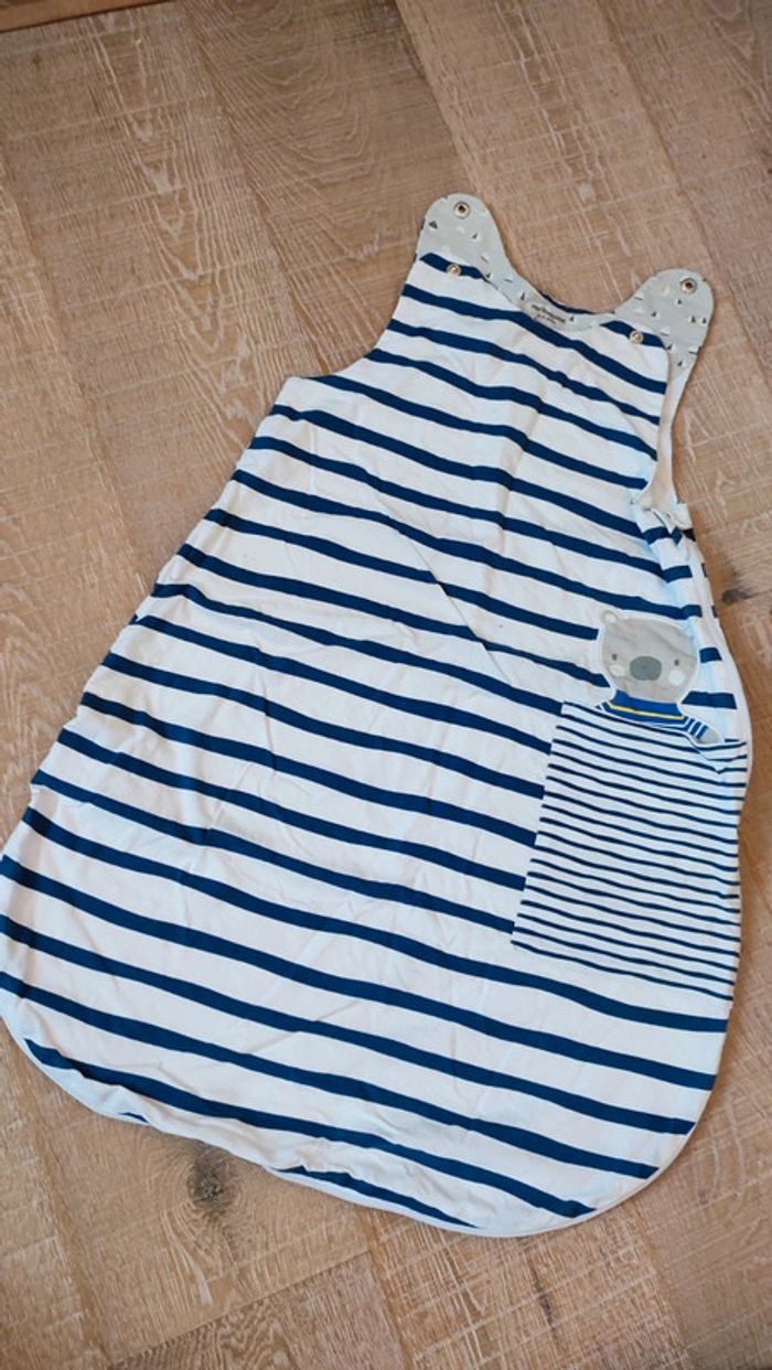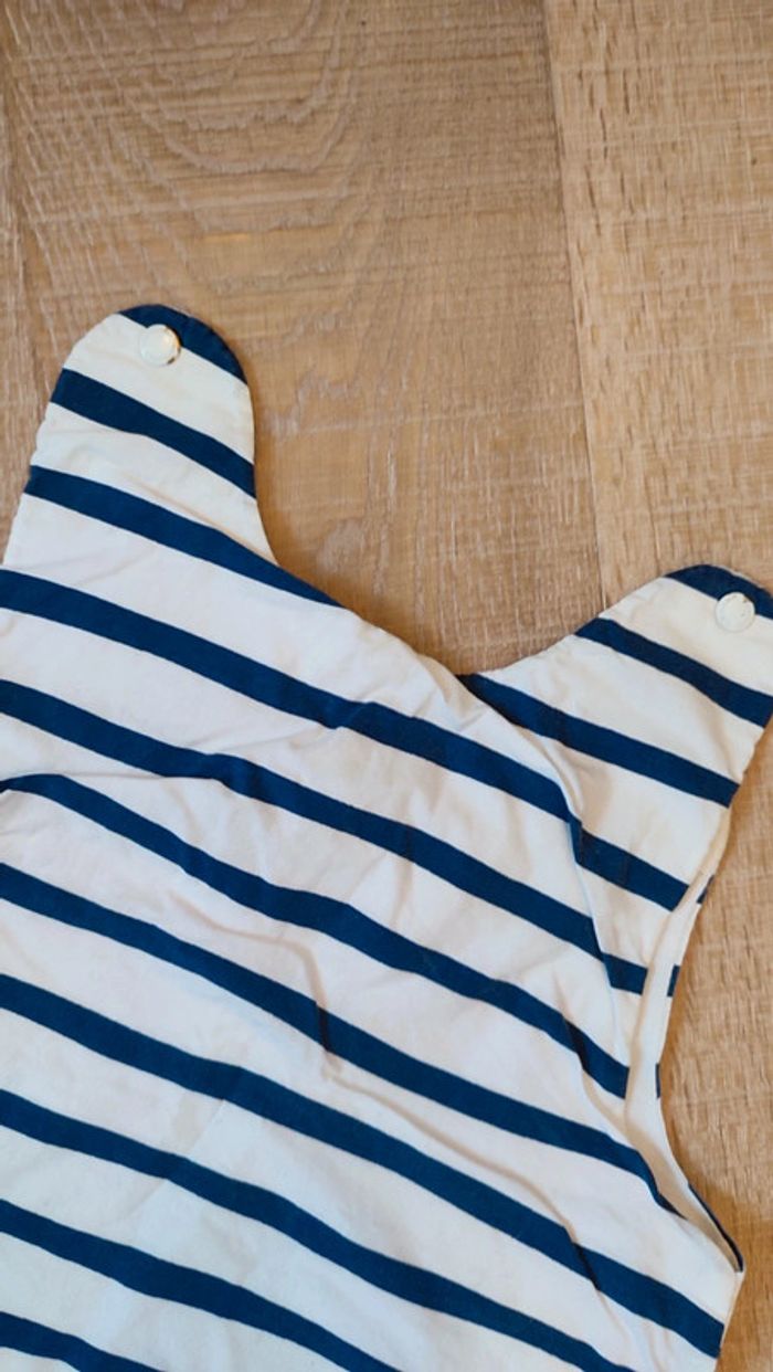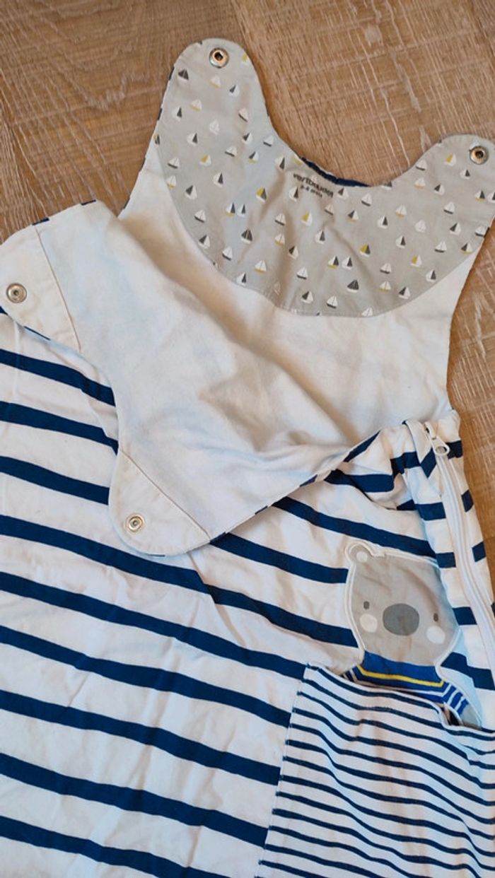 Gigoteuse de la naissance à 6 mois. Fermeture pression au cou et fermeture zippée sur le côté. Motif rayures marinière, poche avec petit ours. Fine et légère Vertbaudet #cicilouuubaby État satisfaisant, beaucoup lavé mais reste en bon état général. Voir dernière photo les pressions son un peu écaillées