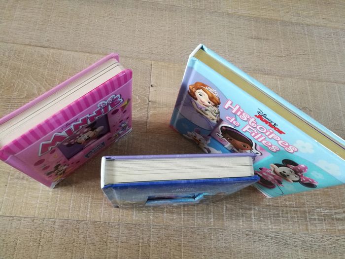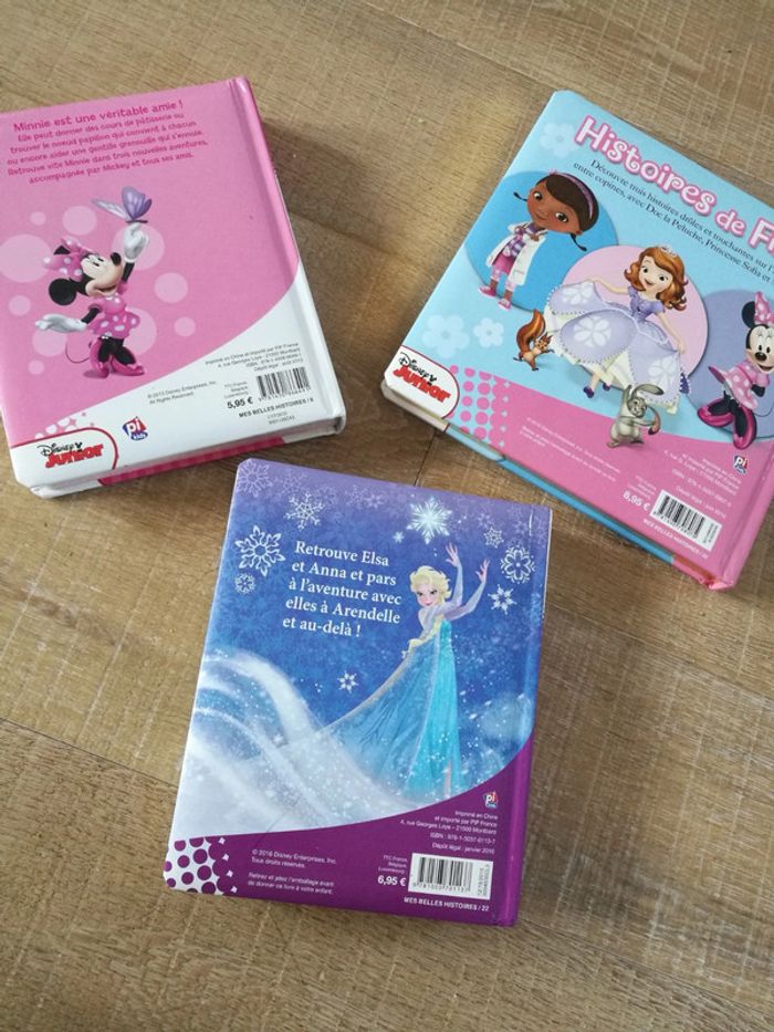 Livres enfants disney ils sont plutôt en très bon état. Les pages sont cartonnées et très épaisses, idéal pour jeunes enfants qui n'ont pas encore de gestes très «délicats» 😊 début maternelle par exemple . Idéal aussi pour les histoires du soir car assez courtes. 1 livre minnie et ses amis (3 histoires) 1 livre reine des neiges (3 histoires) 1 livre histoire de filles (3 histoires, minnie, doc la peluche, Sofia) Le fait que les pages soient cartonnées fait que le poids pour le colis est d environ 2kg les trois livres.