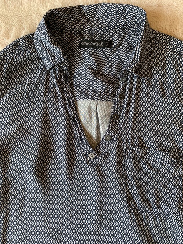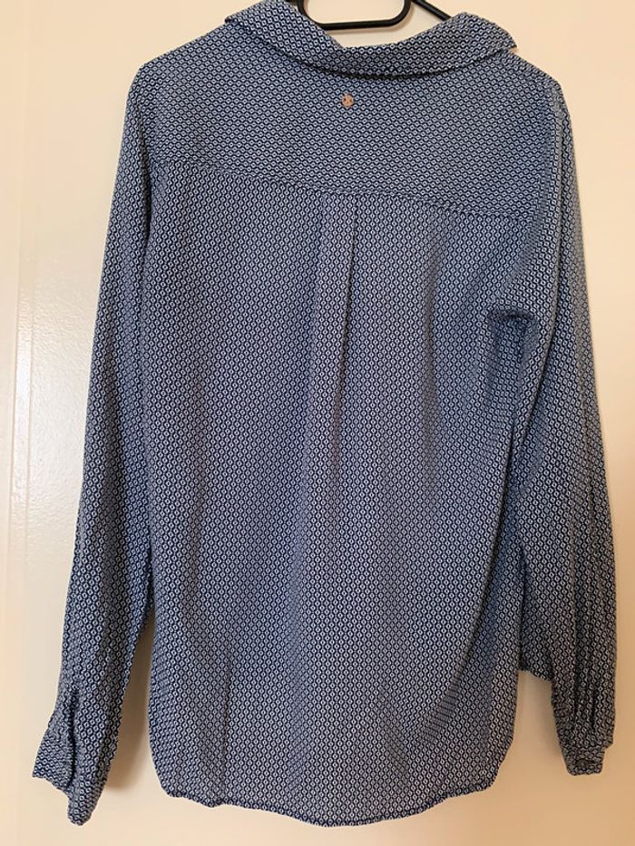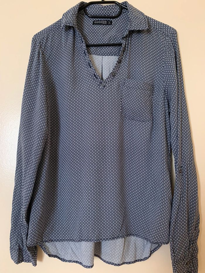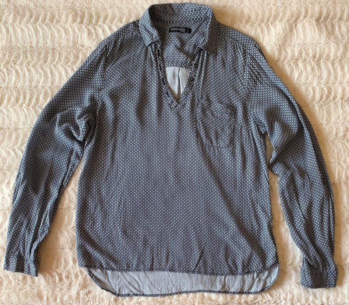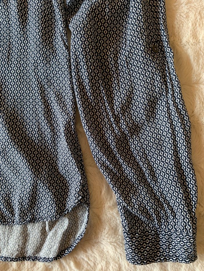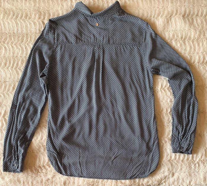 Très bon état peu porté juste étiquette de la composition coupée Blouse manches longues Coupe ample fluide Col en V à revers Manches longues Fermeture boutonnée partielle sur l'avant Fermeture par 1 bouton aux poignets Patte de retroussage avec 1 bouton sur les côtés des manches Bas arrondi au dos Le + mode : ses manches retroussables Tissu principal: VISCOSE 100% #namalo02femmem