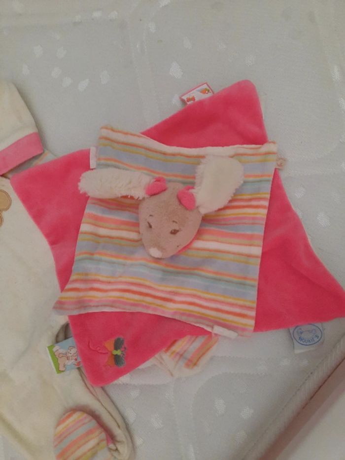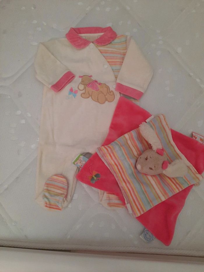 Pyjama fille 3 mois et son doudou assorti Pyjama porté état correct Ouverture pression devant Doudou utilisé très bon état Réduction par lots activées %%%
