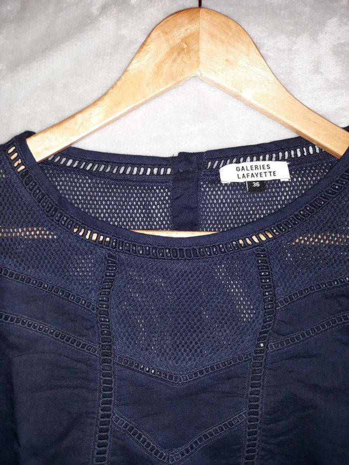 Haut fin beau tissu très léger en coton et polyamide #Galeries Lafayette# Couleur bleu marine foncé Boutonné au dos - ajouré sur le haut devant et derrière Très peu porté (2 fois) Réduction par lots activées %%%