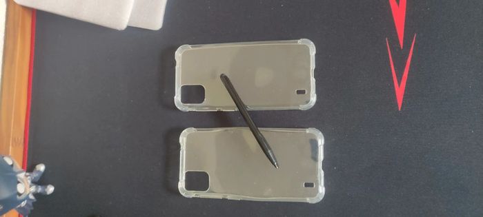 Lot accessoires. Le lot comprend : 2 coques de téléphone, taille environ : 15,5 cm / 7,5 cm 1 stylet pour tablette. En excellent état, sauf une coque qui est légèrement tordue. Ps : j'ignore totalement les téléphones compatibles avec ces coques