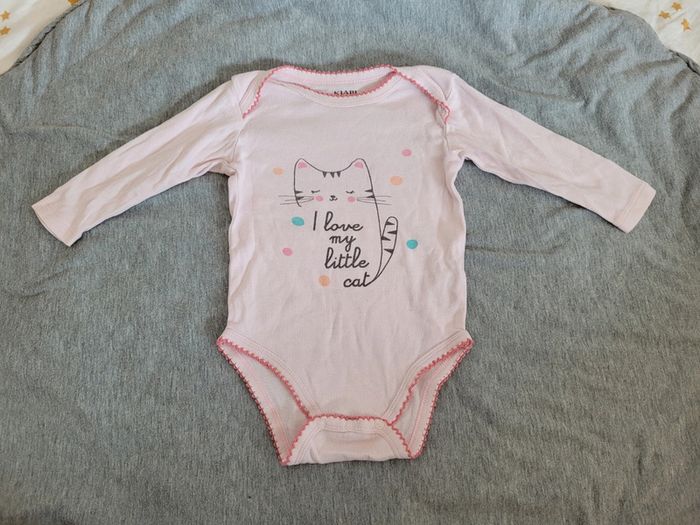 Deux bodies manches longues Kiabi, taille 12 mois. Bon état général. Les 2 se ferment par des pressions au niveau de l'entrejambe. Un rose motif chat. Il a 2 minis tâches qui ne sont pas gênantes sur le body... Un blanc crème motif lapins. Petit noeud en haut.