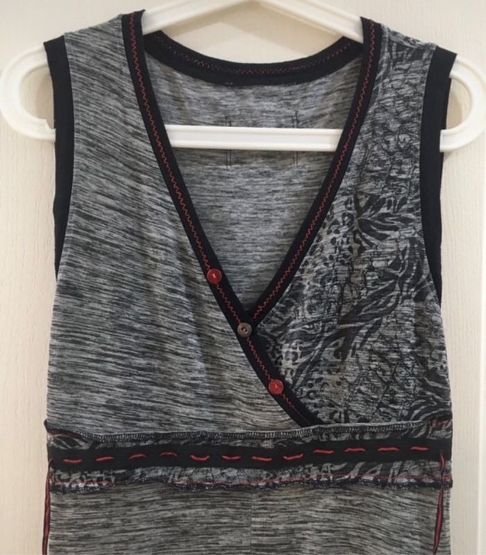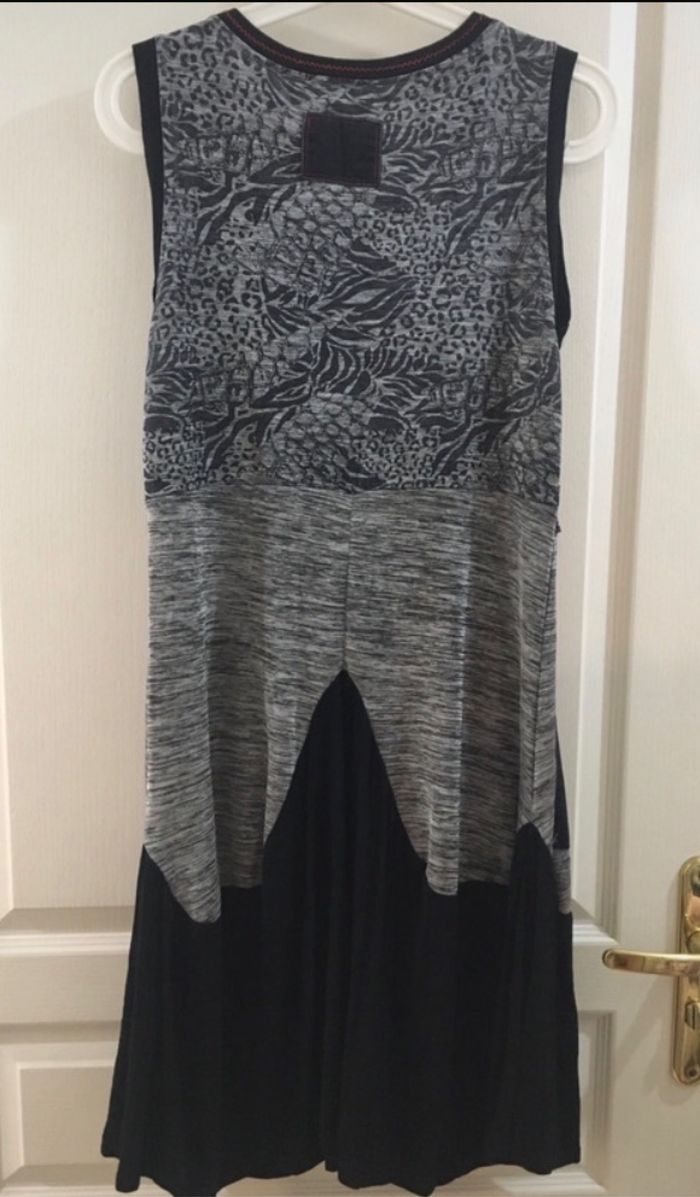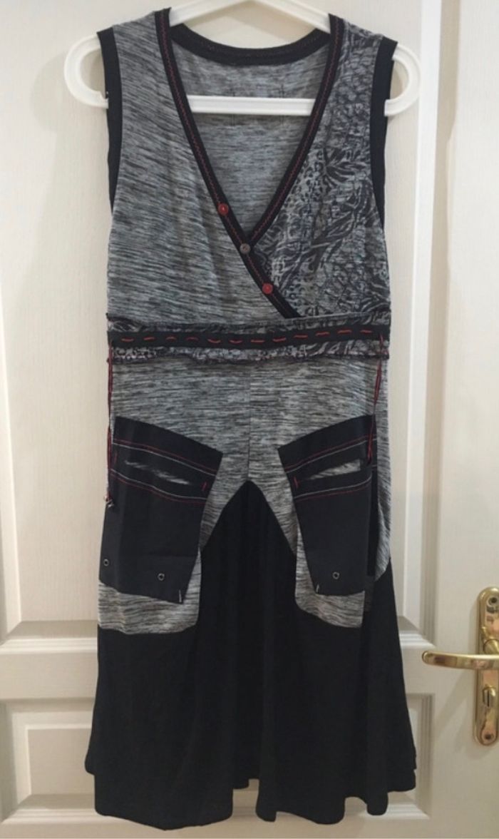 Robe gris et noir, pas d’étiquette, je dirais correspond à une taille XL.
