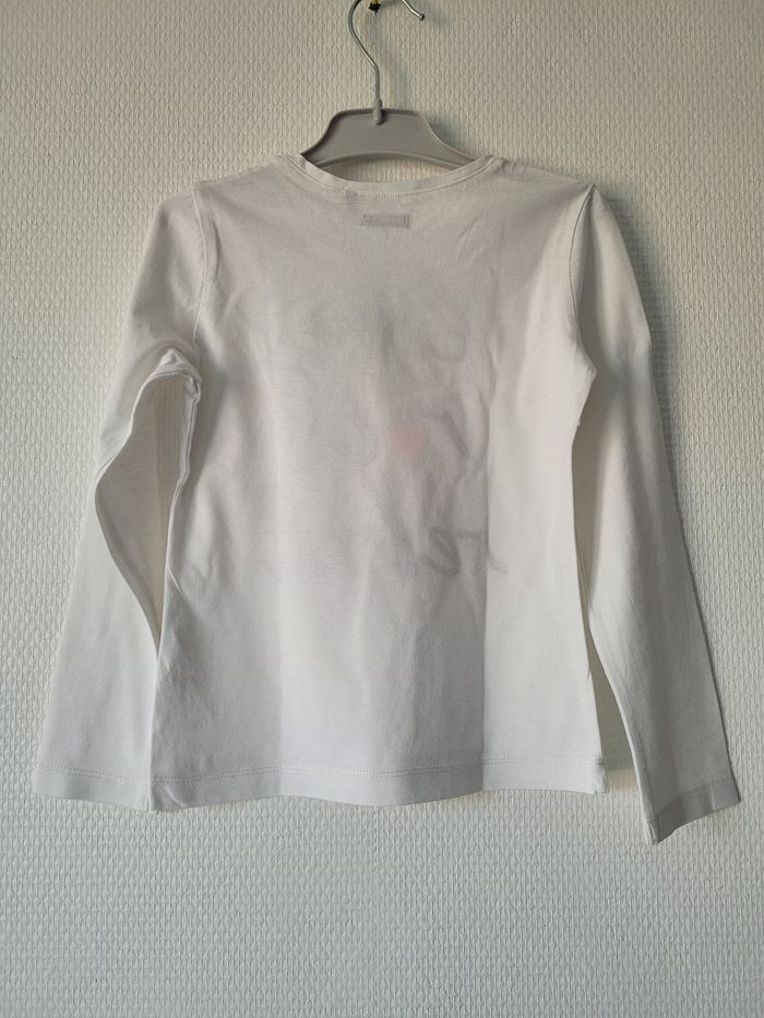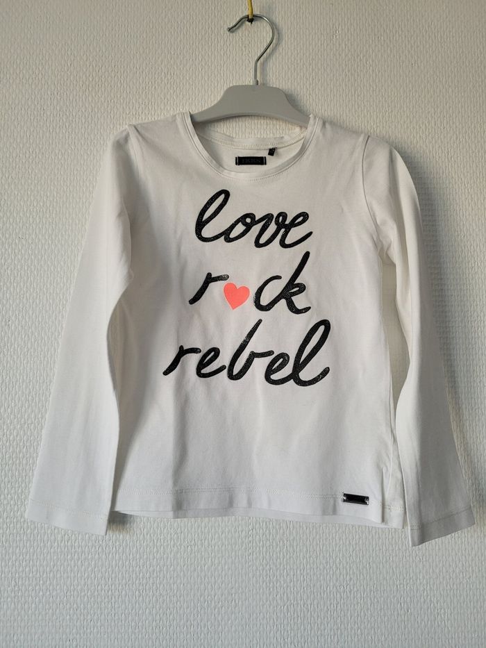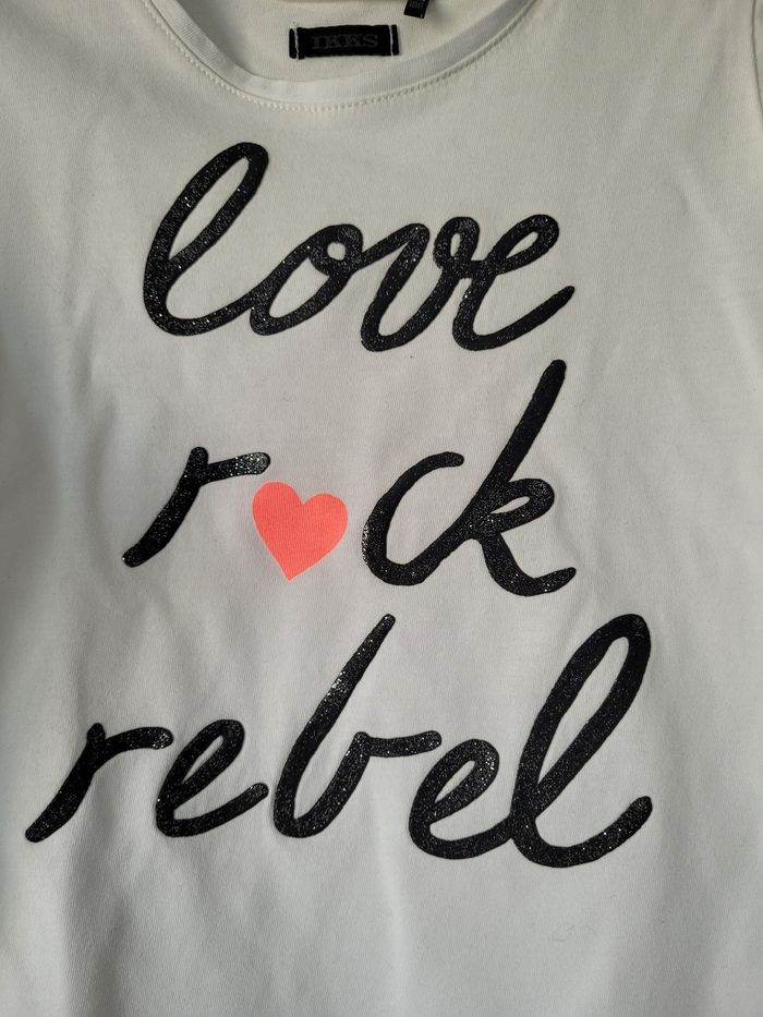T-shirt crème de marque IKKS taille 5 ans Manches longues Message "love rock rebel" en noir pailleté sue le devant 100% coton En parfait état