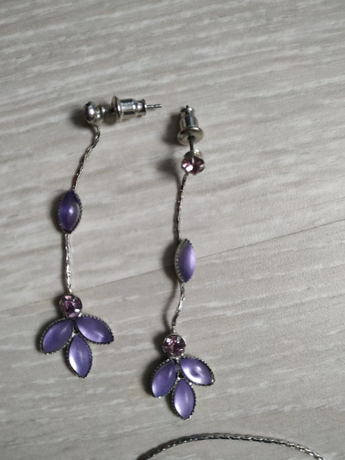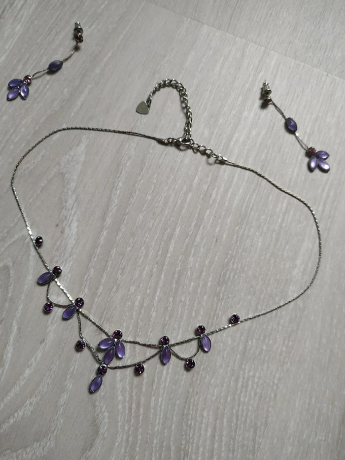 Parure argentée et violet Collier et boucles d'oreilles. Très bon état