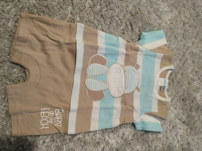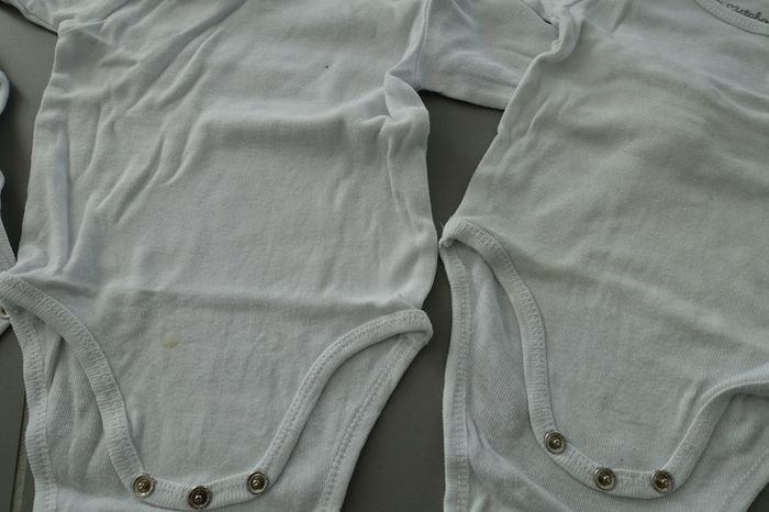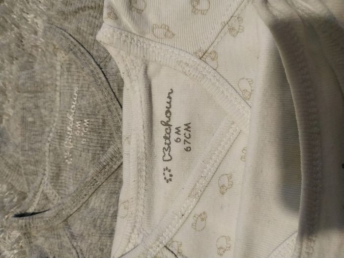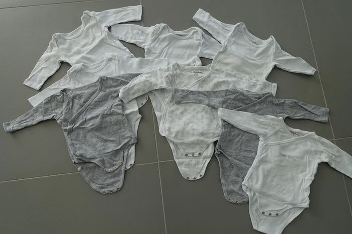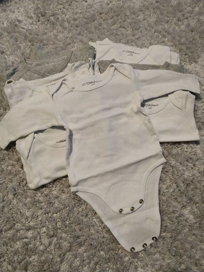 Lot de 8 bodies manches longues Kitchoun 6 mois 67 cm 4 croisés devant 4 passages par la tête Blancs et gris (2 bodies blancs sont légèrement jaunis) Combinaison short "Baby on the beach" 6 mois Neuf jamais porté