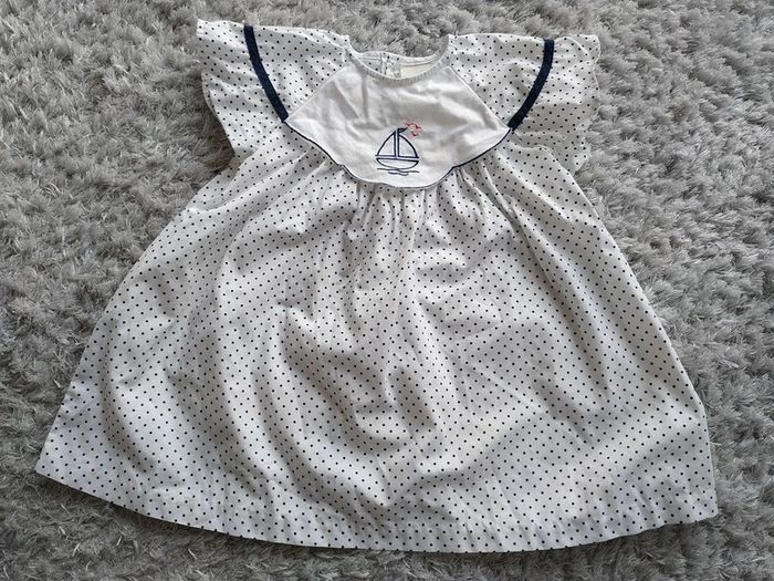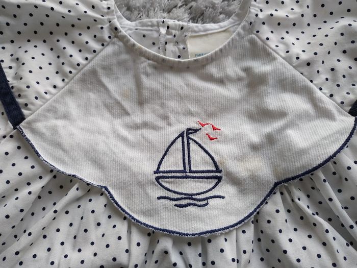 Robe Blanche pois bleus marines Sucre d'orge 12 mois 74 cm Tâches jaunies sur zone blanche (là où se trouve le bateau) et une tâche plus bas, cf photos 3 et 4