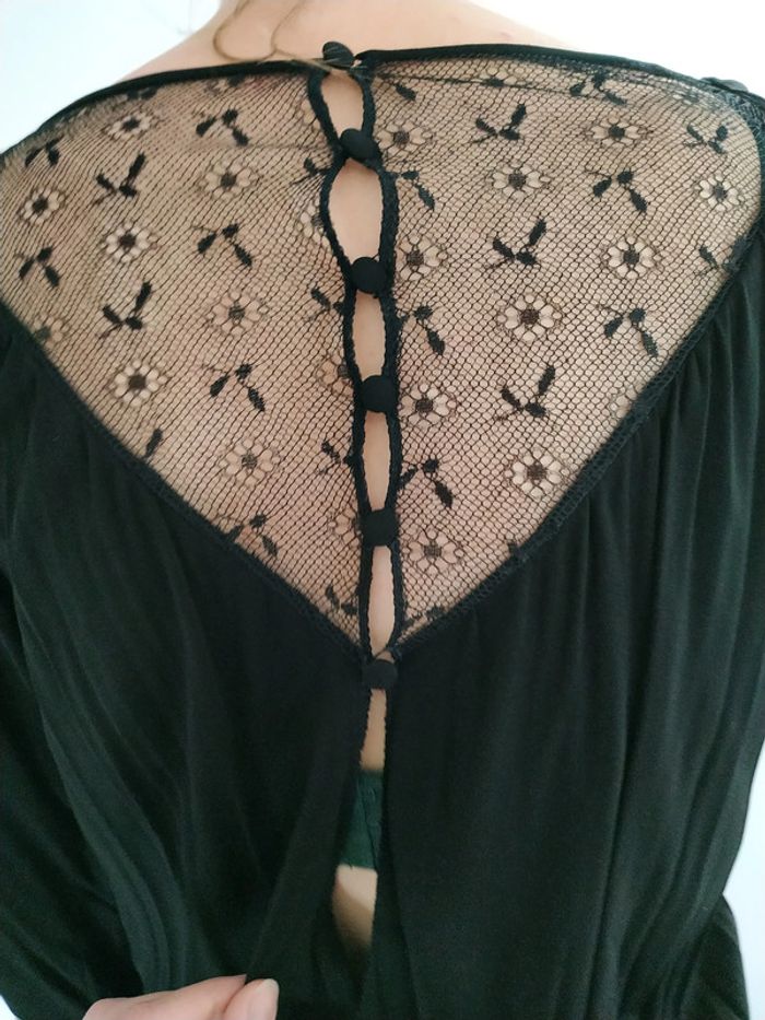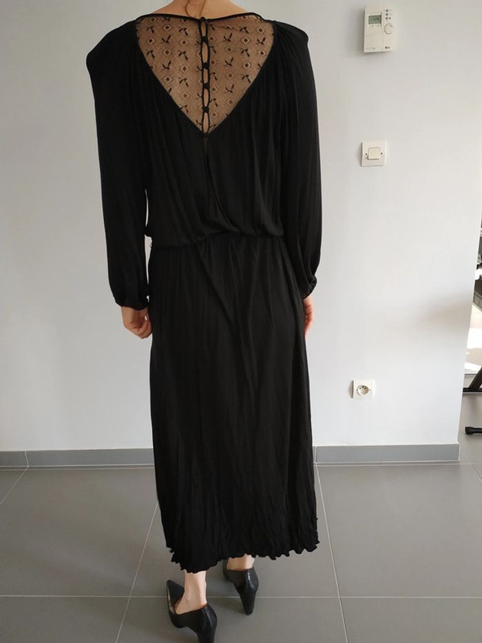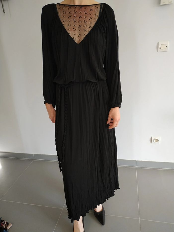 Robe noire dentelle Manches longues Ceinture Robe longue Taille élastique Taille estimée 38 Le mannequin fait normalement un 36-38. Marque Saramel Paris Style Vintage Saramel