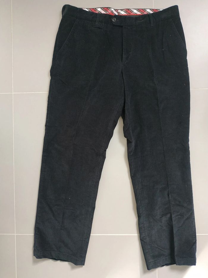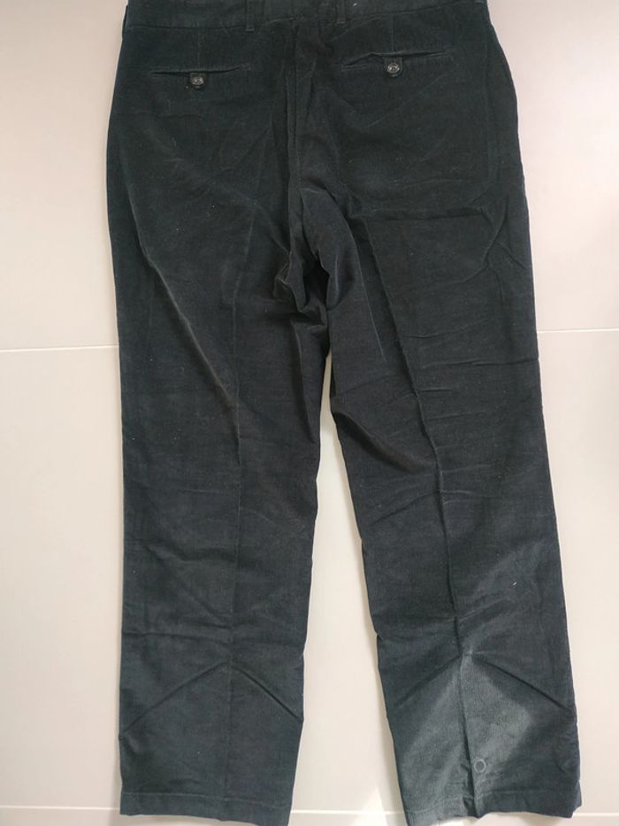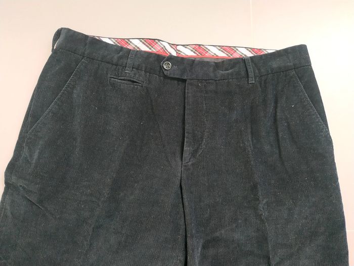 Pantalon noir aspect velour côtelé fin 100% coton Taille estimée 52 Tour de taille 98 Longueur jambes extérieur 106 Longueur jambes intérieur (enfonçure-bas) 80