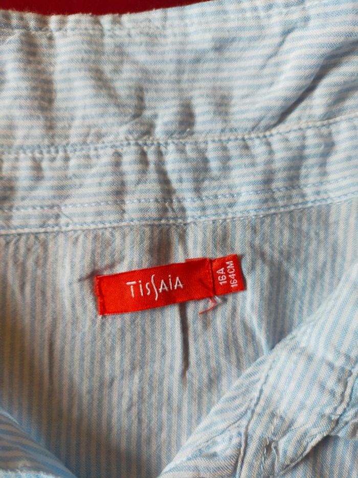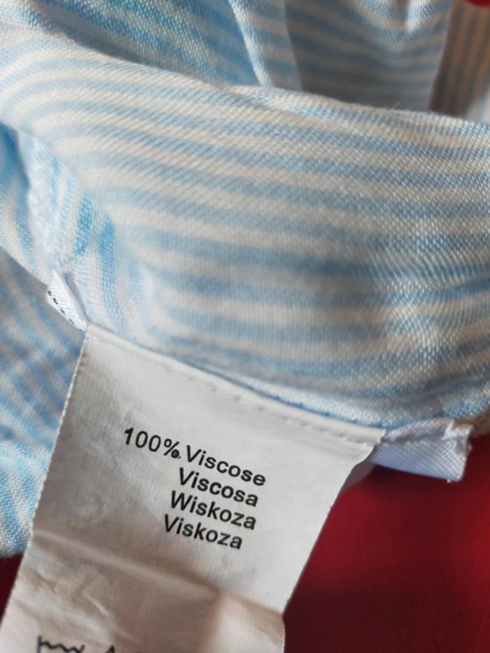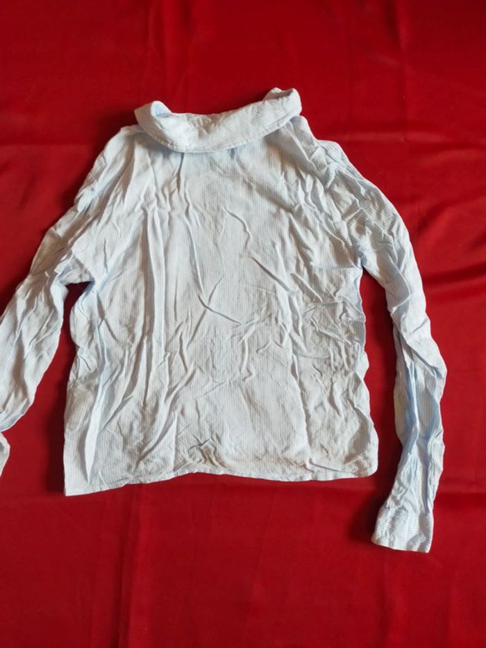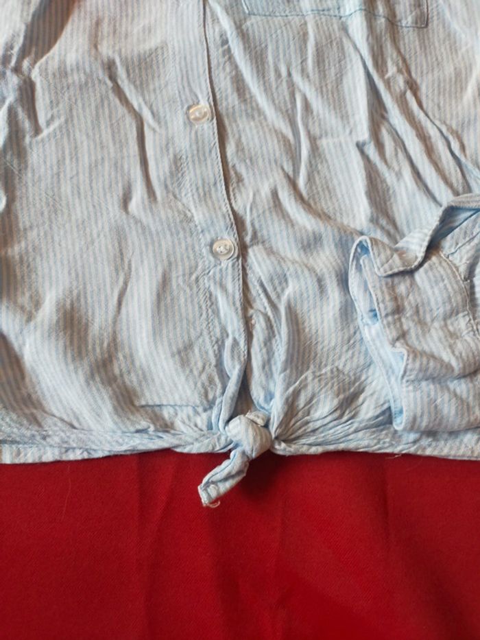 Jolie chemise froisser à manches longues mai peut se repasser. Rayures verticale bleuciel et blanc, des petit motif brodé au niveau de la poche, et un petit noeud en bas. Porté 1 fois 100% viscose
