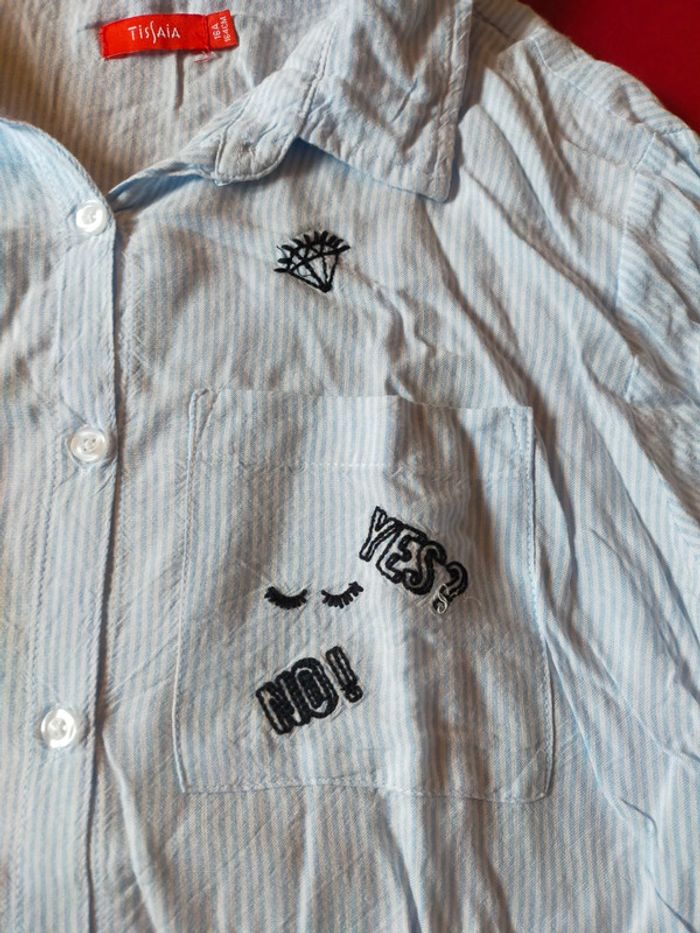 Jolie chemise avec noeud en bas et motif sympa brodé  rayures bleu clair et blanc - photo numéro 3