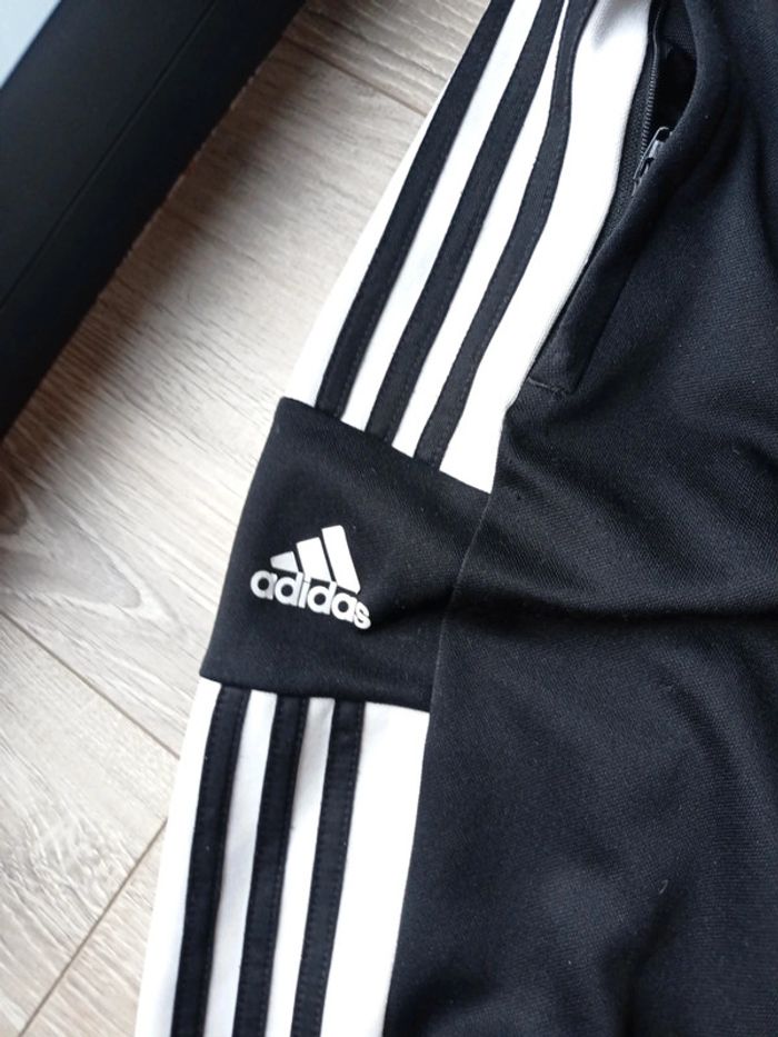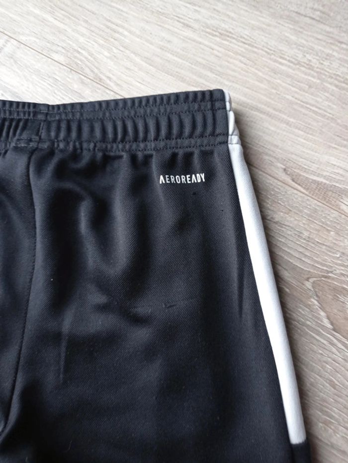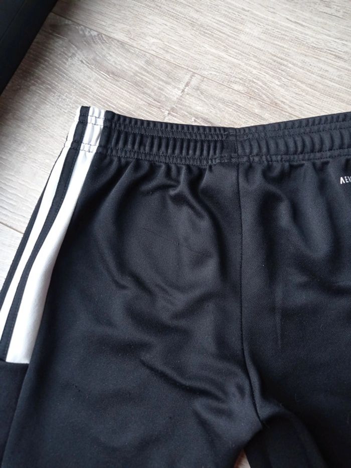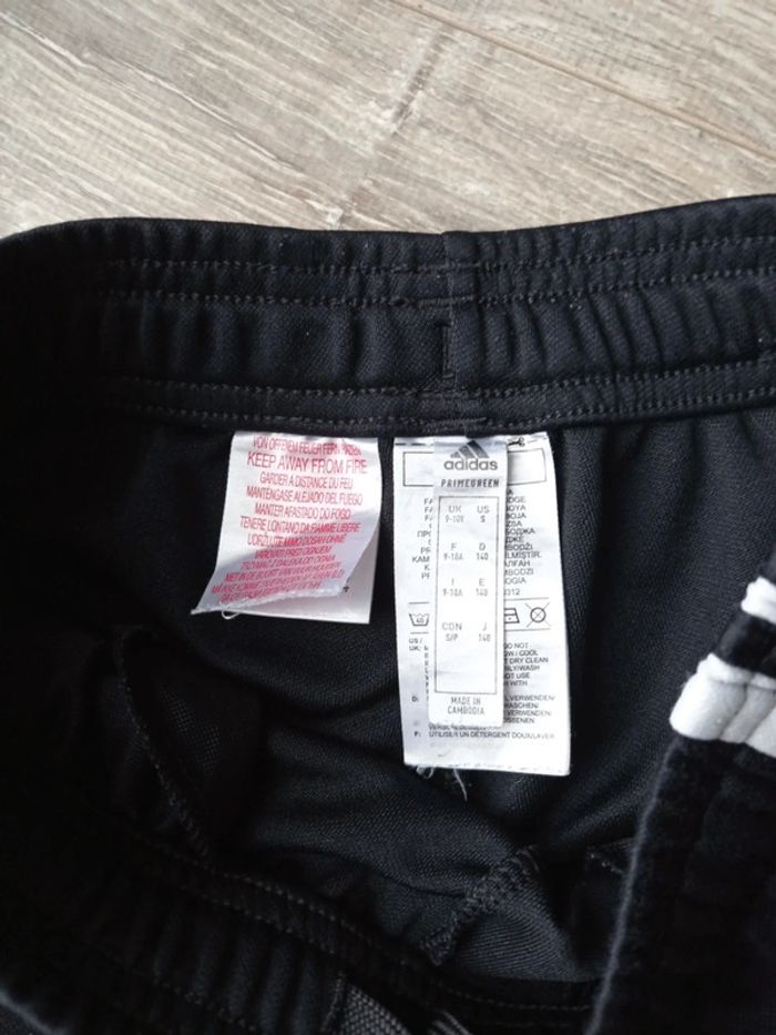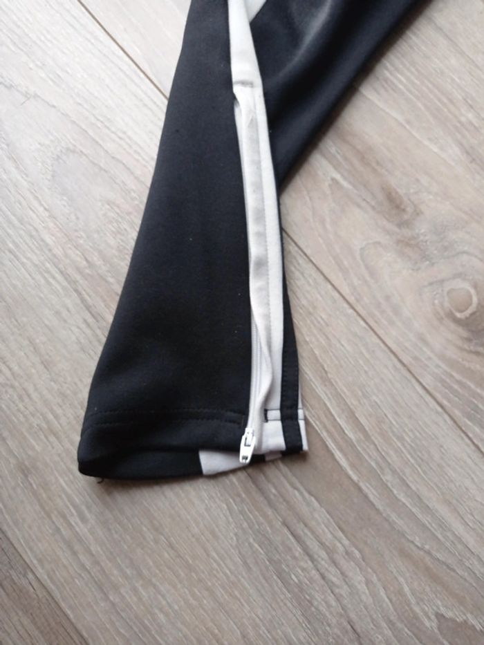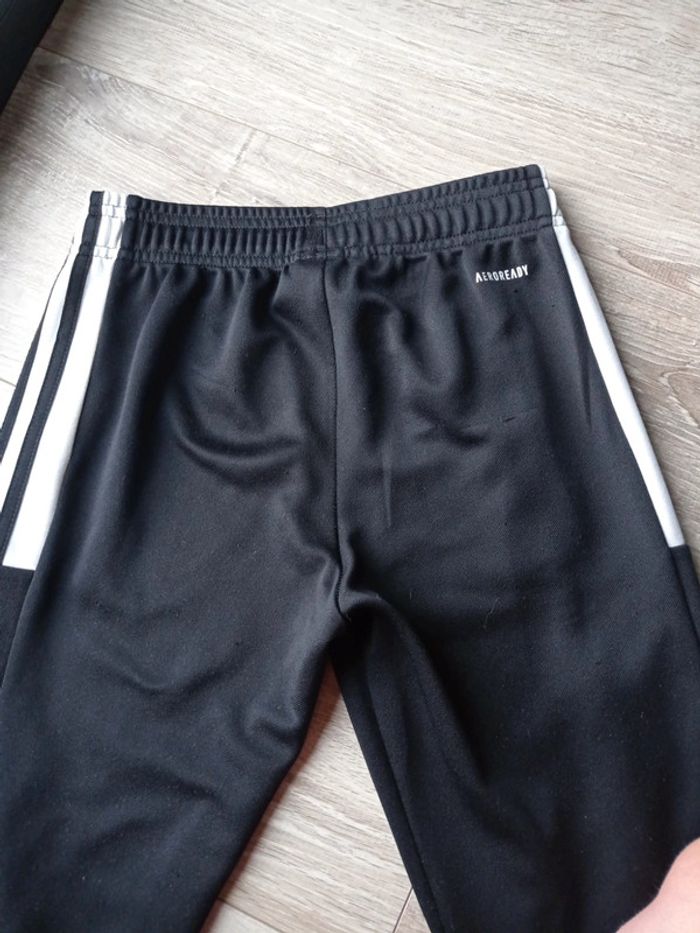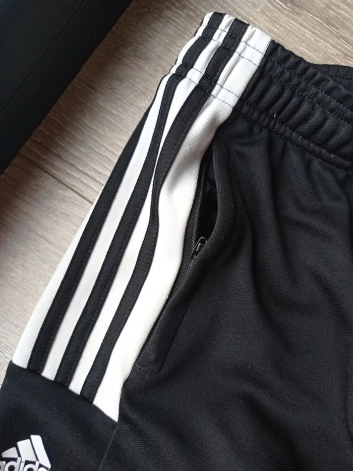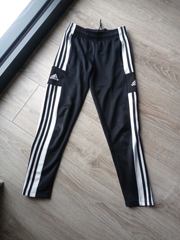 Bas de jogging adidas avec fermetures éclairs en bas des jambes et aux poches. Taille réglable avec lacet de serrage. Deux fils tirés sur l'arrière (voir photos) mais ne se voit pas sauf si on a le nez dessus!! Taille 9/10 ans #pegouille_dixans