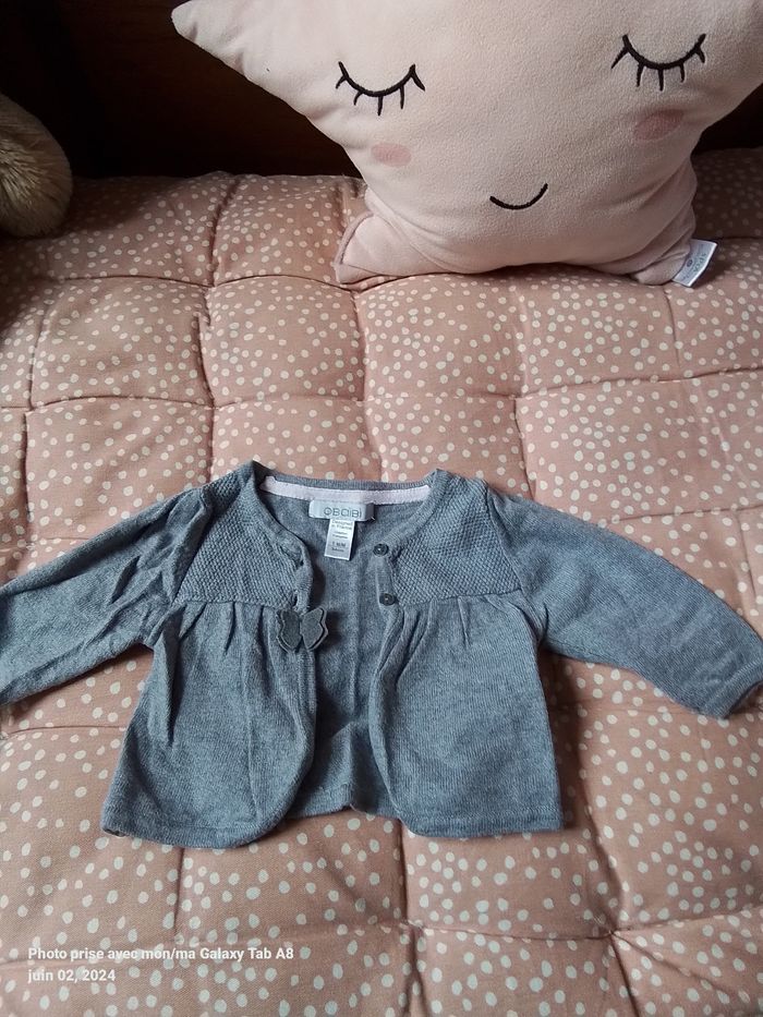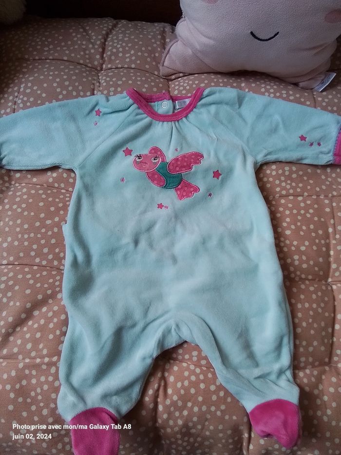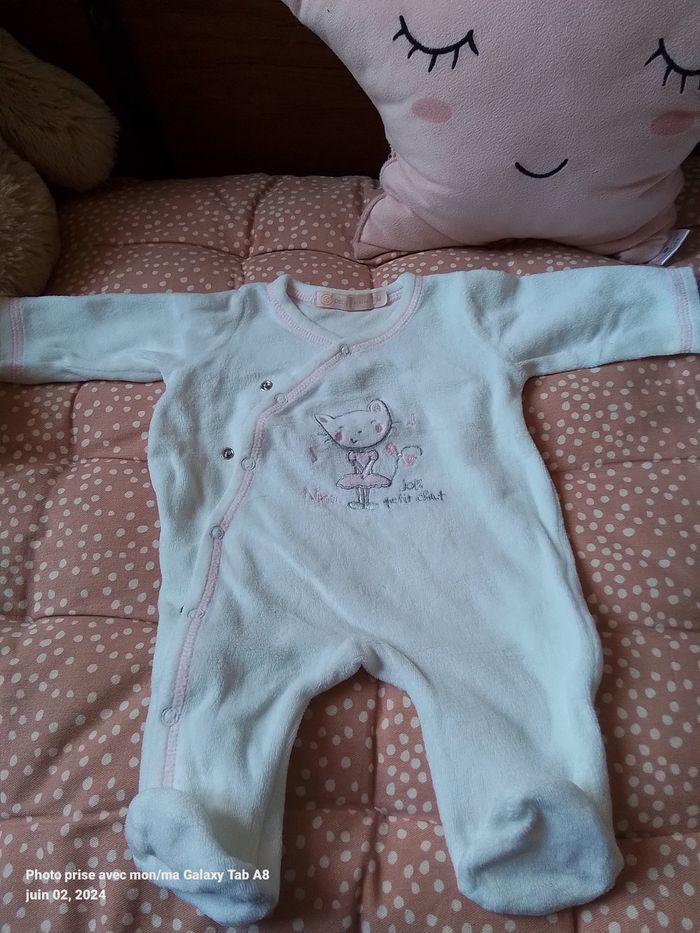 Lot de 4 vêtements fille 1 mois : 1 pyjama bleu clair kitchoun 1 pyjama blanc gemo 1 gilet gris obaibi 1 tunique rose kitchoun