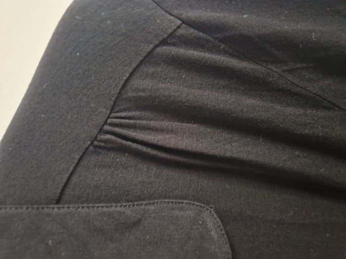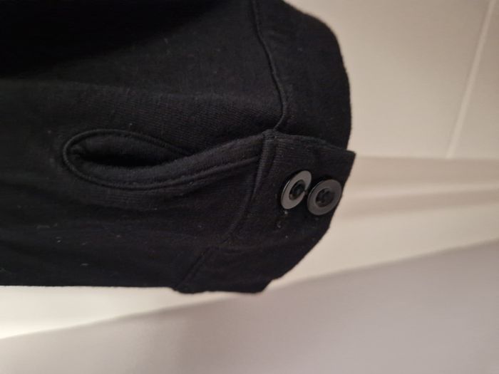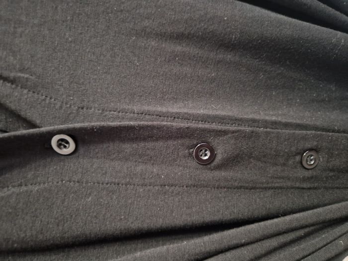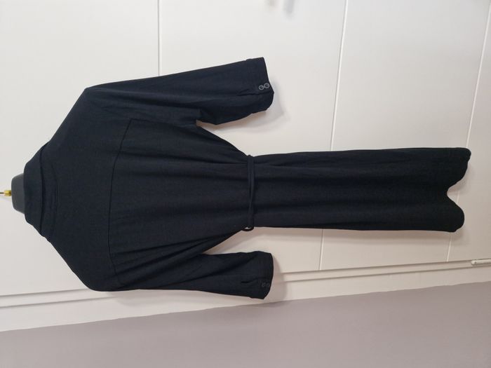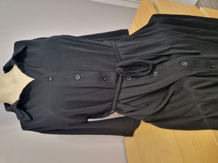 Robe d'été noire, boutonnée sur toute la longueur, avec ceinture et passants Petites fronces au niveau des épaules, manches 3/4 se terminant par une goute et des boutons décoratifs En viscose et élasthanne, tissu doux et ultra fluide et à la fois suffisamment "lourd" pour ne pas remonter Taille 42 Excellent état, comme neuve