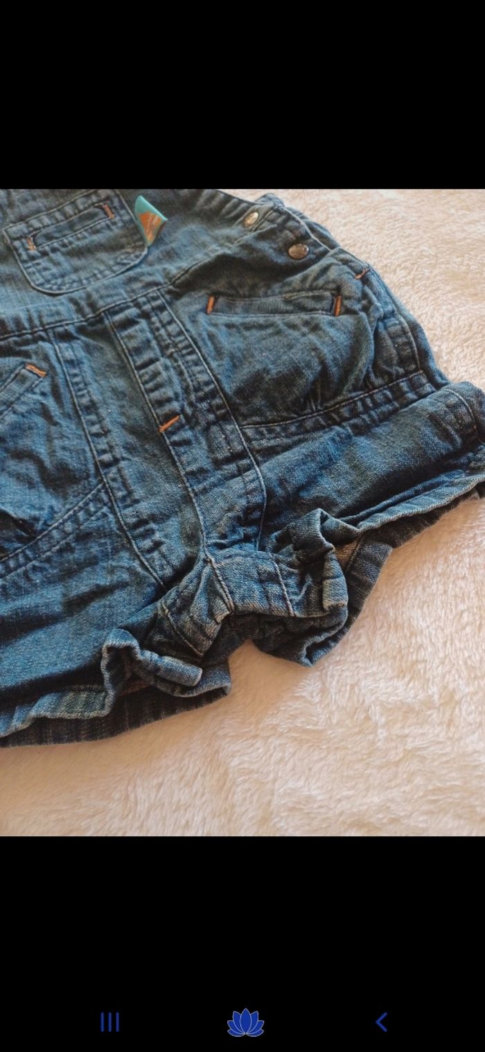 Salopette courte en jean réglable au niveau des bretelles, pressions à l entrejambe
