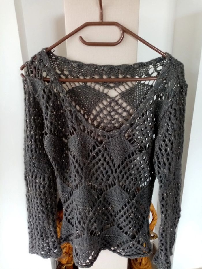 Pull gris maille Ajourée liserai or - photo numéro 1