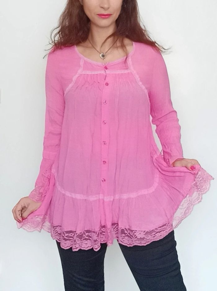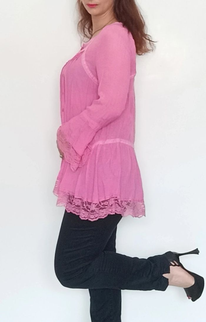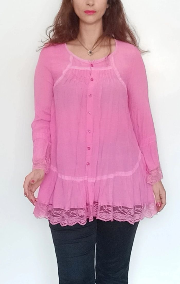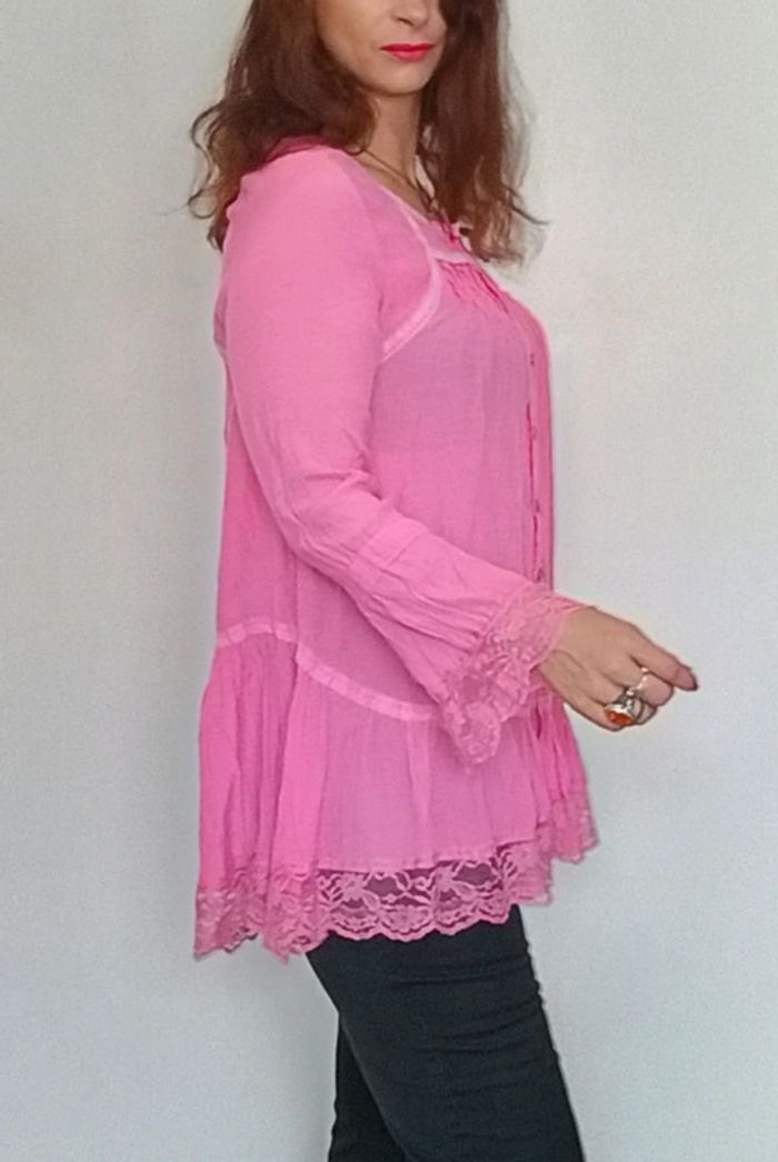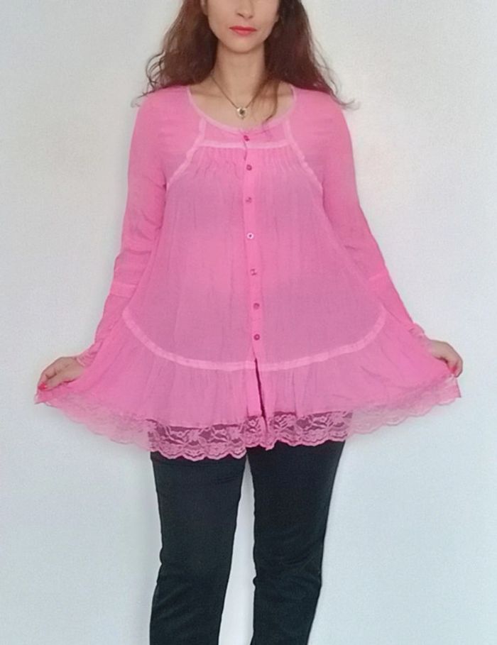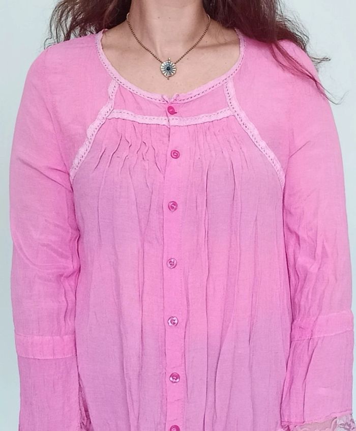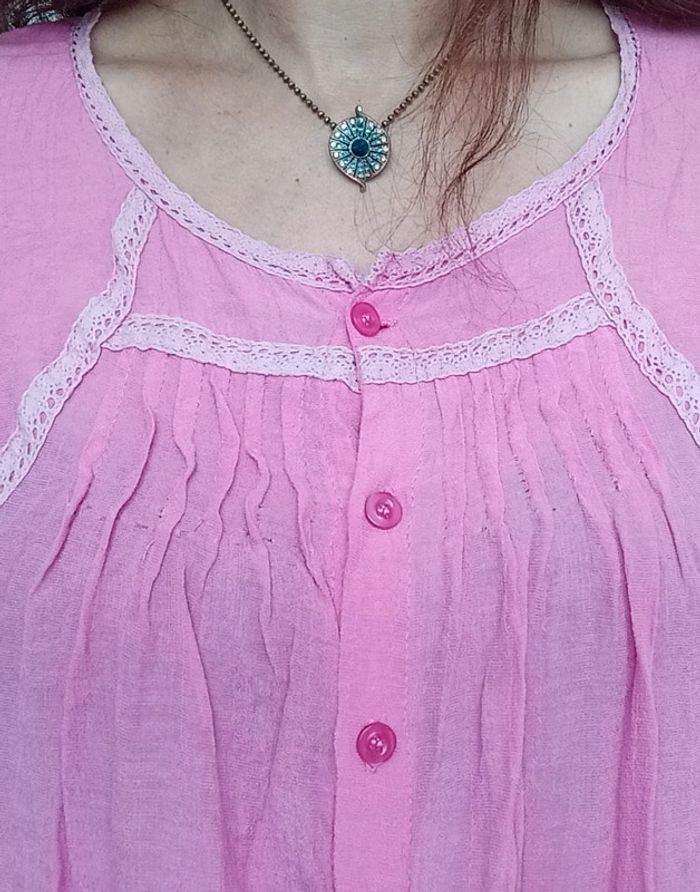 📣 Pour un lot, me contacter 😊🌸 -10% pour deux articles achetés -20% pour trois et + 🥰 #poupoupidoutu 🫶🫶🫶🫶🫶🫶🫶🫶 Chemisier long bas froufroutante avec dentelle, broderies rose pâle, confortable et facile a porter, seulement bon état car minis trous d un fil de couture enlevé au buste, vraiment peu visible 😉 voir dernière photo #chemisierose #chemiserose #chemisierbrode #chemisierlong #chemisefroufrou #chemisierfroufrou #chemiseromantique