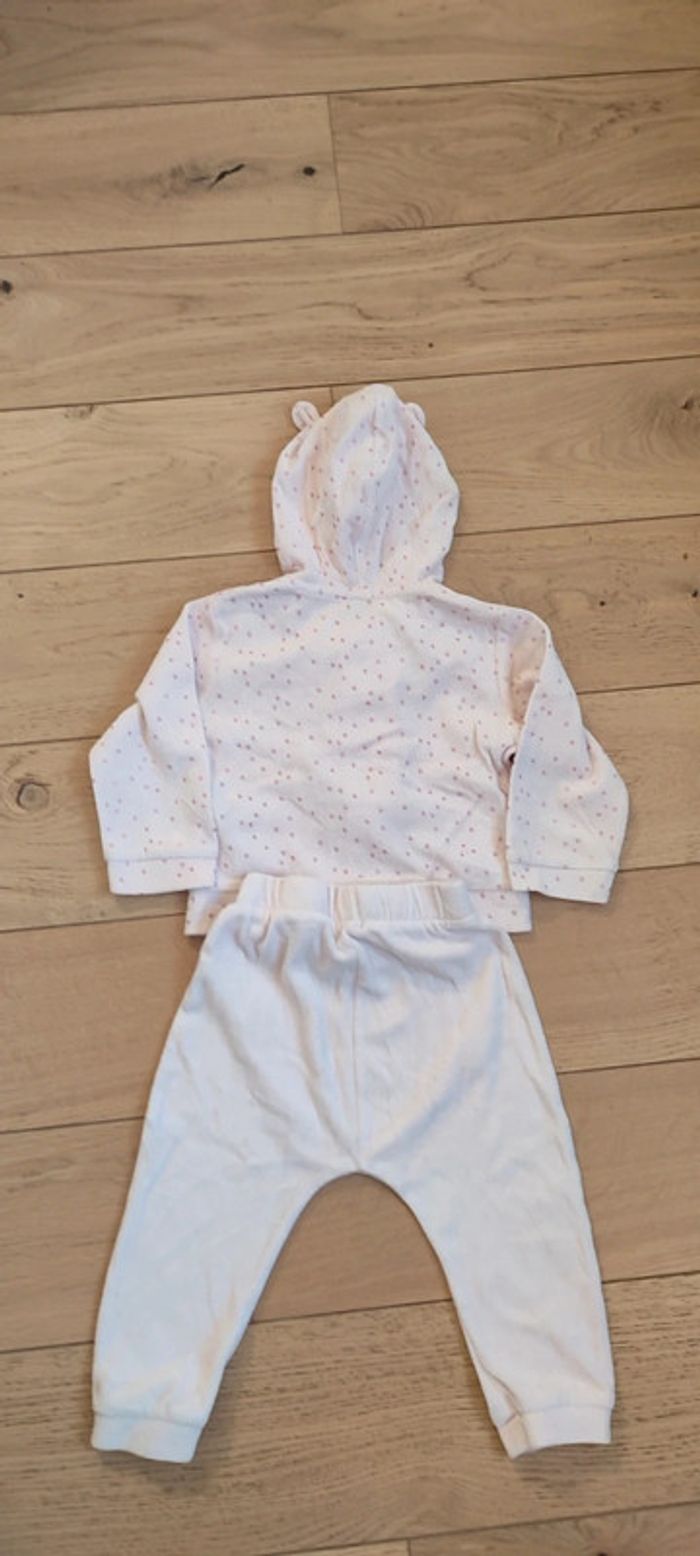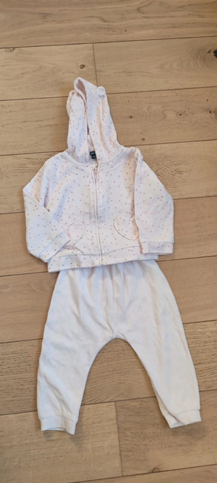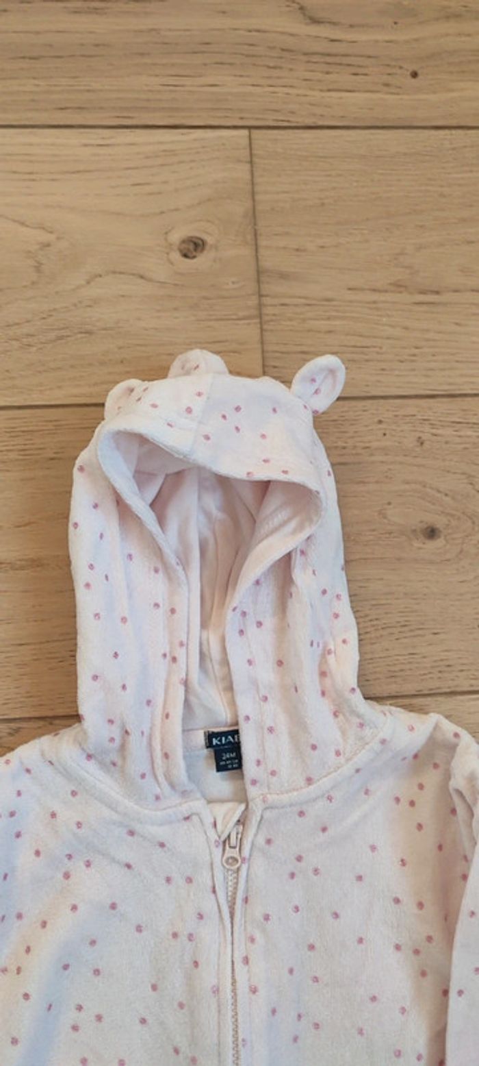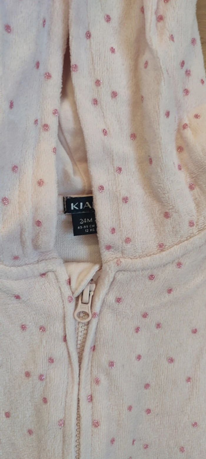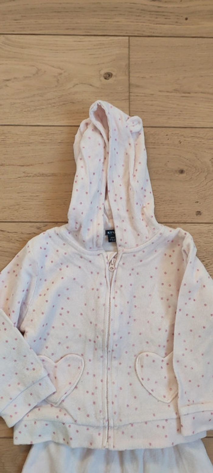 Pyjama kiabi 2 ans , pantalon+ veste à capuche avec des oreilles. Velours , roses avec des points roses pailletés