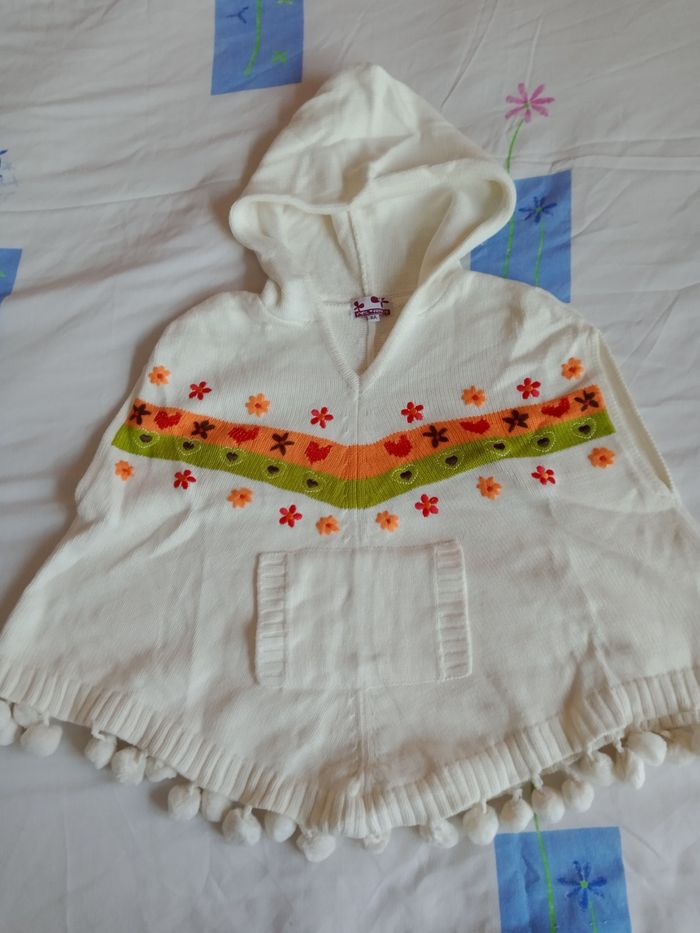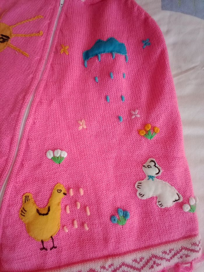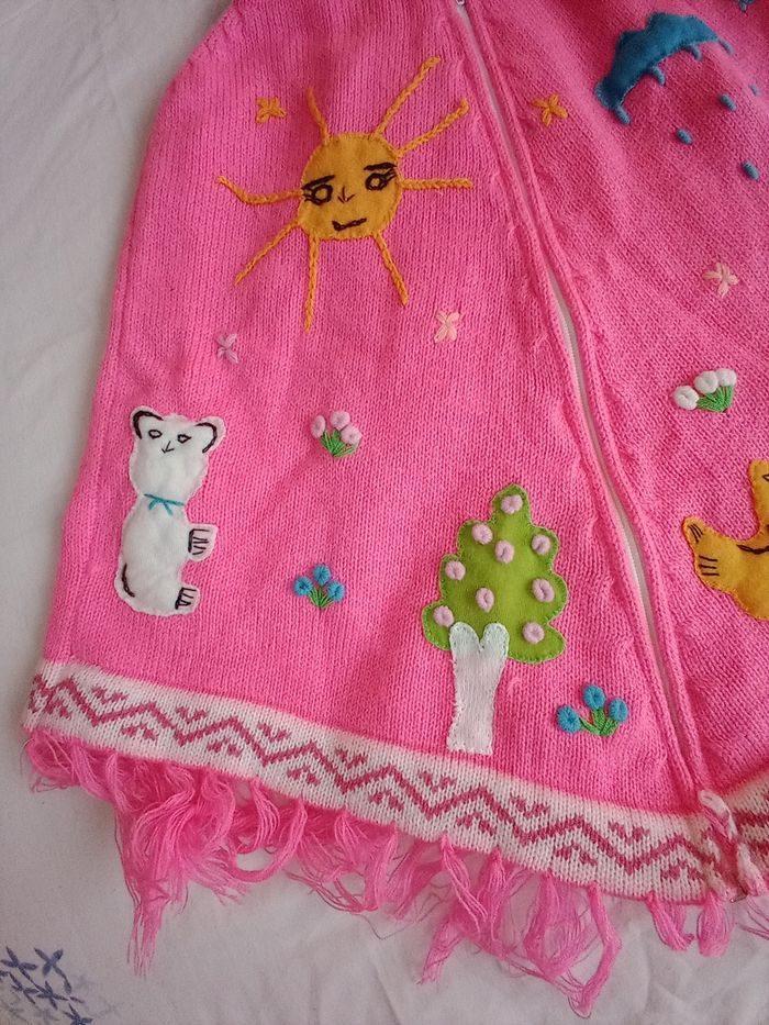 poncho rose à capuche fabriqué main (motif avec du relief) (6-10ans) Également a la vente poncho écru avec motif fleurs orange et vert 8 ans