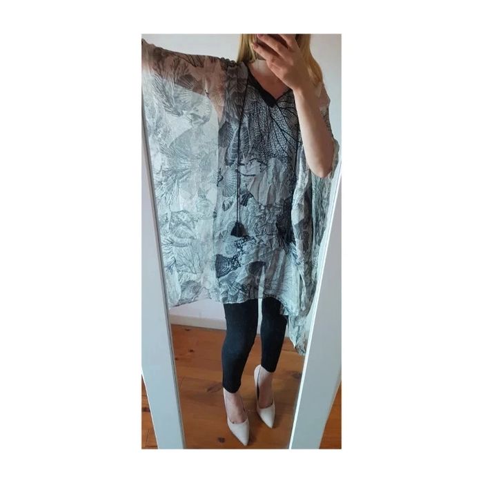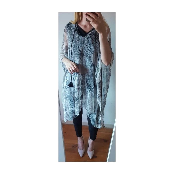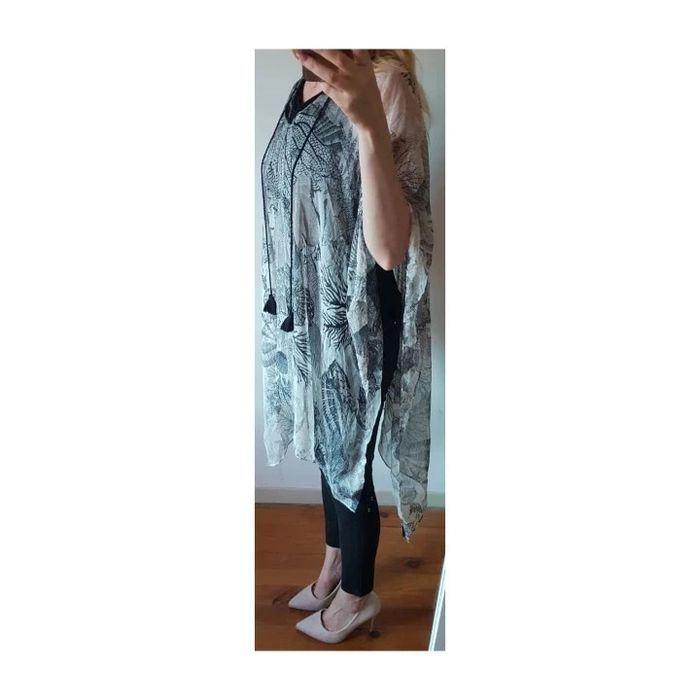 〰️Poncho blouse en tissu vaporeux avec motifs imprimés, modéle avec liens à nouer à l'encolure terminé par un pompom franges à la base (valeur 24,99 euros) peut convenir pour la ville comme pour la plage ✔️à porter sur un total look noir, à retrouver également en vente dans mon dressing 🌸Etat: TBE (mis qu'une fois) 🌸Marque: H&M 🌸Taille: T.38 🏷 Réductions sur les lots activées ⏳ Pas de réservation ✂️ Les colis sont emballés soigneusement 🎁 Un petit cadeau sera mis dans chaque colis #virginie63zfemme #virginie63ztaille38 #virginie63zété #virginie63zhm #virginie63zblouse