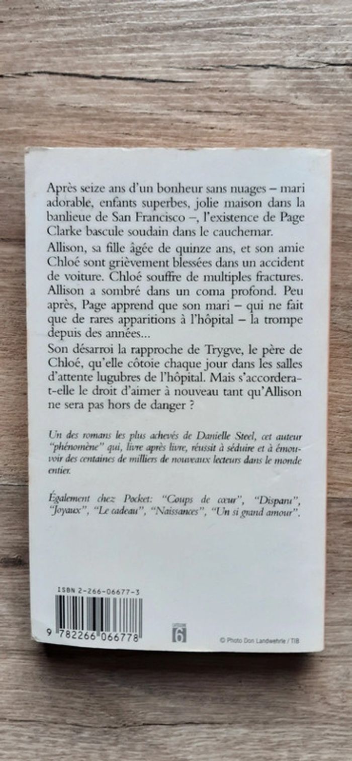 331pages. poche. Broché. Après seize ans d'un bonheur sans nuages -mari adorable, enfants superbes, jolie maison dans la banlieue de San Francisco -, l'existence de Page Clarke bascule soudain dans le cauchemar. Allison, sa fille âgée de quinze ans, et son amie Chloé sont grièvement blessées dans un accident de voiture. Chloé souffre de multiples fractures. Allison a sombré dans un ccma profond. Peu après, Page apprend que son mari -qui ne fait que de rares apparitions à l'hôpital -la trompe depuis des années. Son désarroi la rapproche de Trygve, le père de Chloé, qu'elle côtoie chaque jour dans les salles d'attente lugubres de l'hôpital. Mais s'accordera-t-elle le droit d'aimer à nouveau tant qu'Allison ne sera pas hors de danger ?
