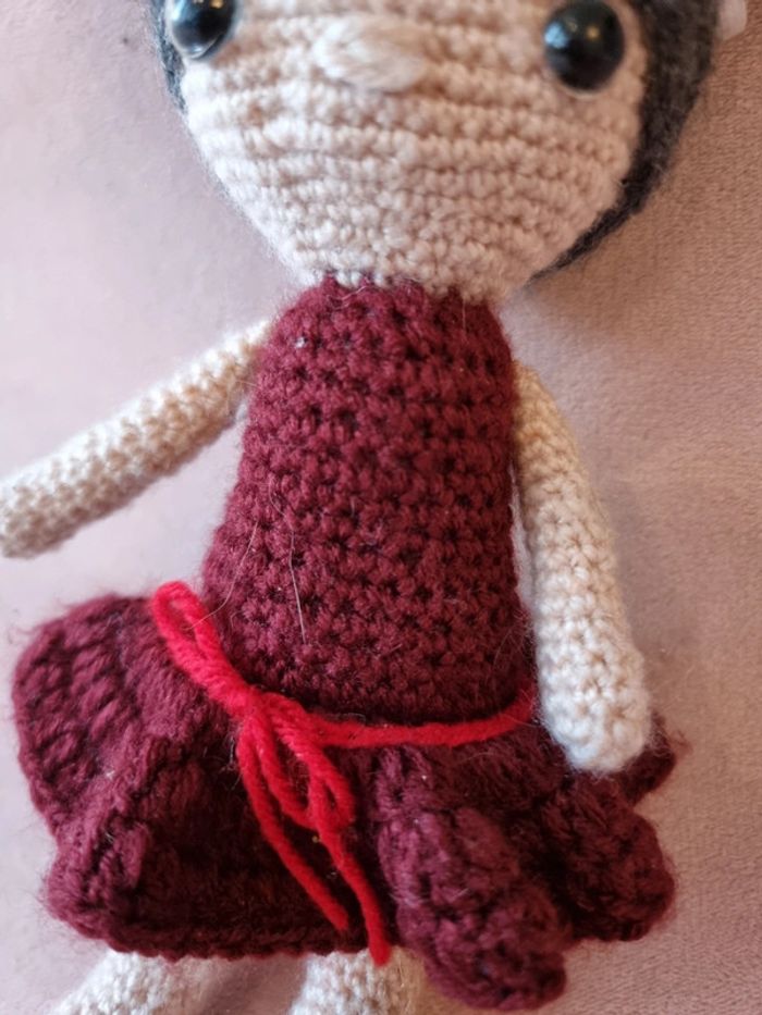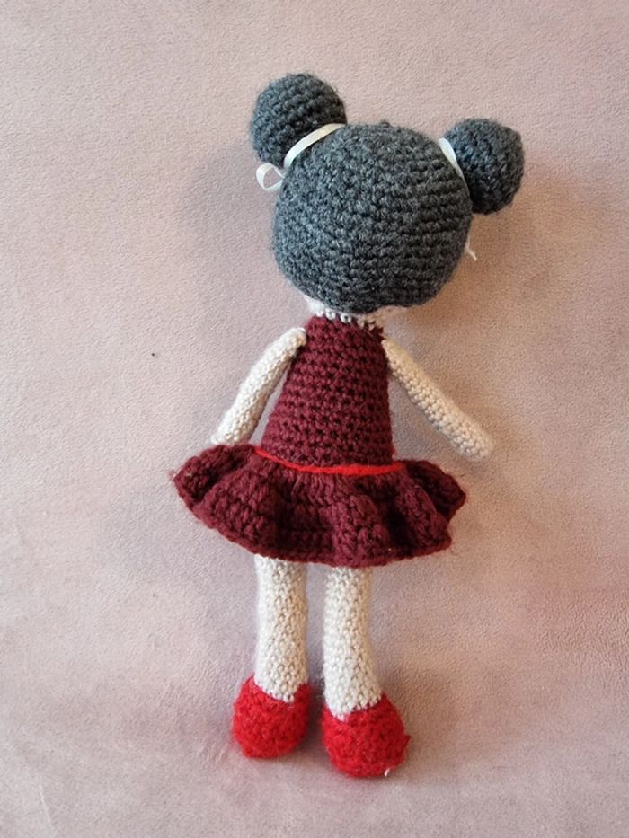 Petite fille au crochet Cheveux gris avec deux chignons et ses petits noeuds soyeux Yeux boutons Robe rouge avec chaussures assorties Taille 24cm En très bon état #angel_enfant_jeu_peluche