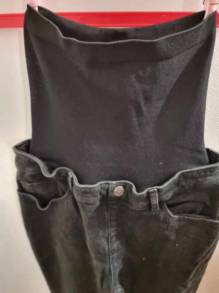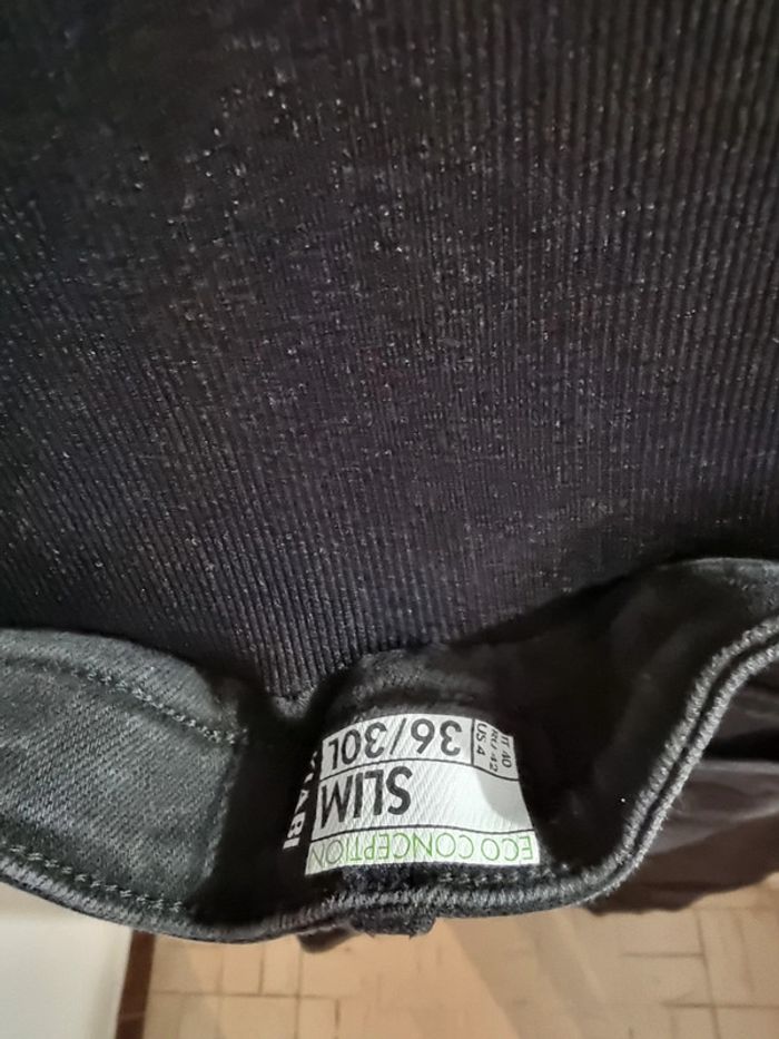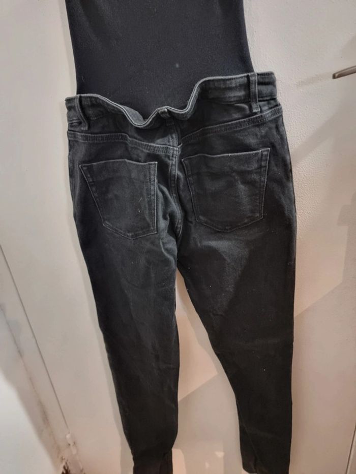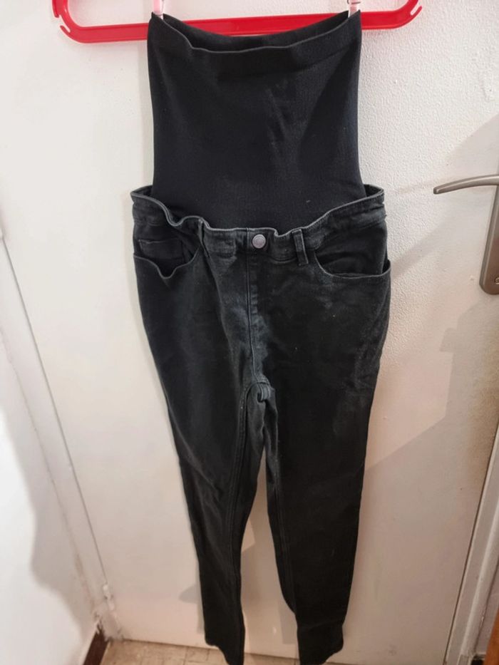 Jean noir skinny Kiabi grossesse La coupe skinny classique en version maternité : imparable ! - Jean de grossesse - Coupe skinny - Matière super stretch - Bandeau élastique pour le ventre - Bouton fantaisie devant - Passants ceinture - 2 poches factices devant - 2 poches plaquées au dos - Longueur entrejambe : 74 cm environ - Largeur bas de jambe : 14 cm environ Taille 36 Taille correctement. Très peu porté. Deux fois seulement, car cela ne tombait pas à la bonne saison pour ma première grossesse. Puis non porté depuis. En très bon état. Bandeau élastique en très bon état.