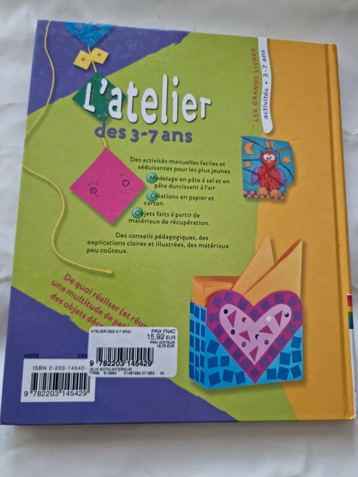 L'atelier des 3 7 ans En très bon état général Des activités manuelles faciles et séduisantes pour les plus jeunes. Modelage en pâte à sel et en pâte durcissant à l'air, Créations en papier et carton, Objets faits à partir de matériaux de récupération. Des conseils pédagogiques, des explications claires et illustrées, des matériaux qui seront peu coûteux. #angel_enfant_jeu_loisircréatif #angel_livre_enfant