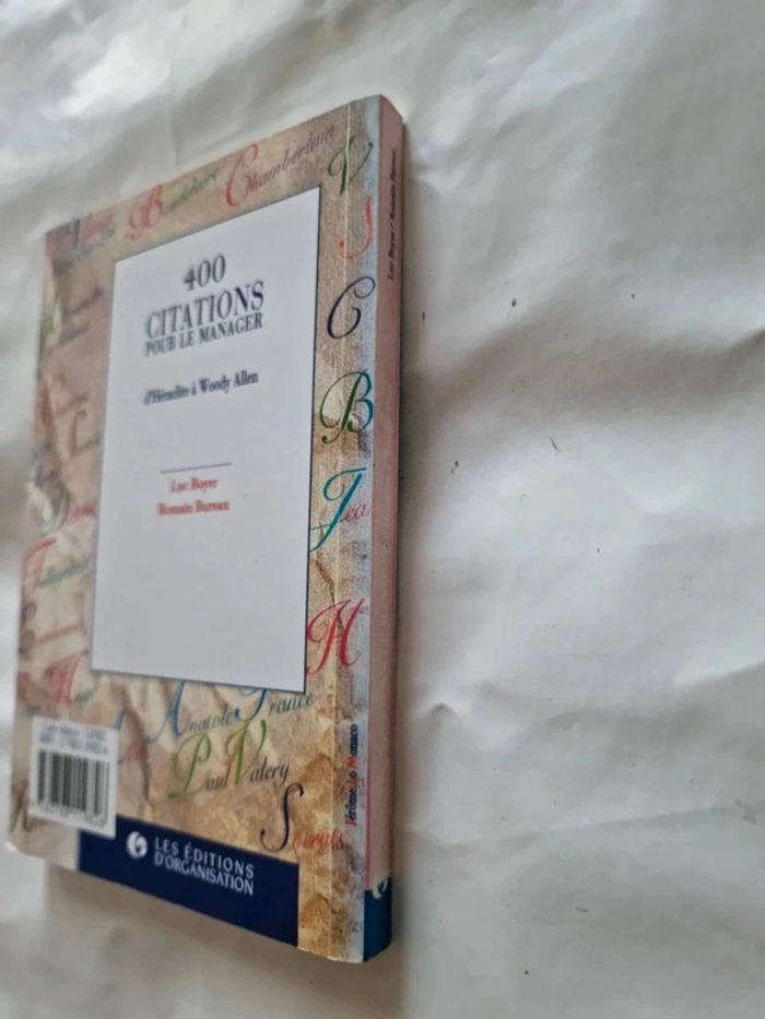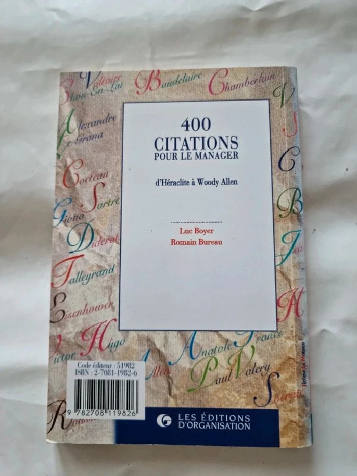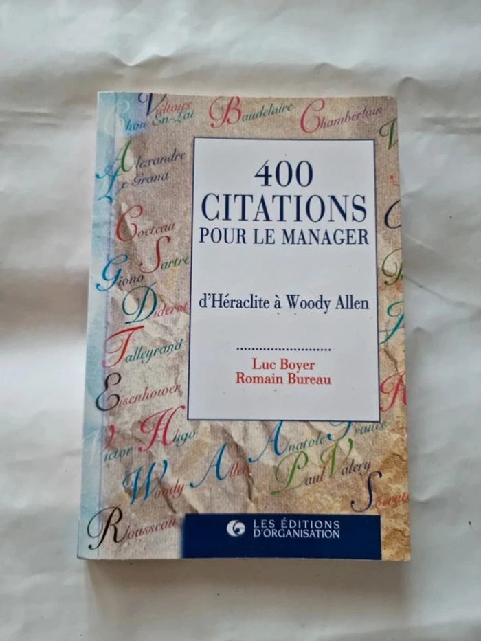400 citations pour le manager D Héraclite à Woody Allen Lyc Boyer et Romain Bureau Anticiper et prévoir Innover et remettre en cause Mettre en œuvre Produire et vendre Manager les ressources humaines Comprendre les attitudes et comportements Communiquer Respecter l'éthique En très bon état général. #angel_livre_adulte_société