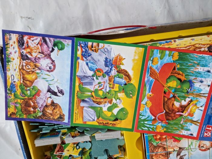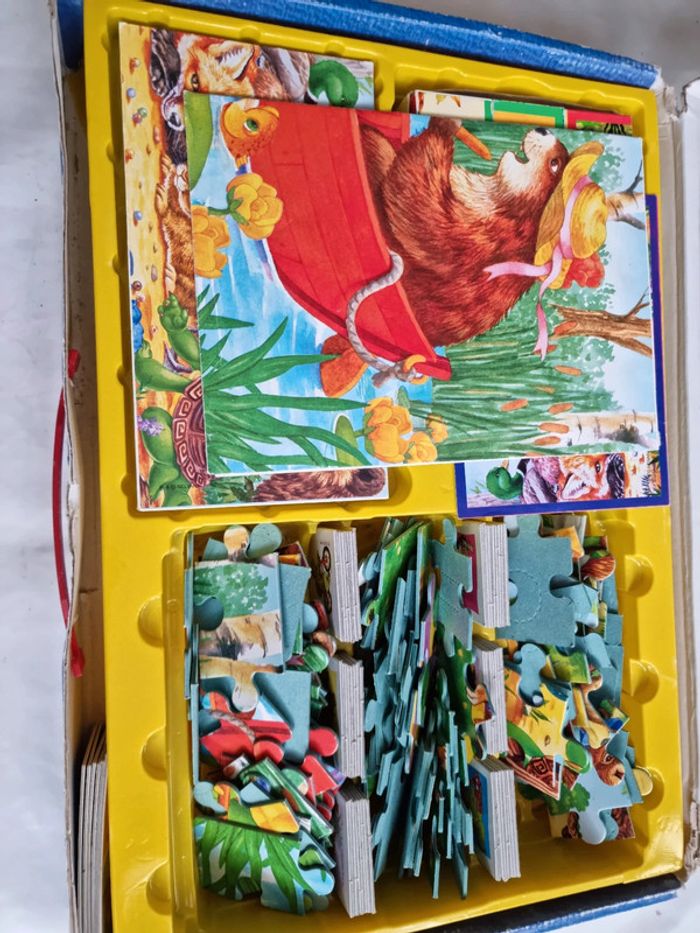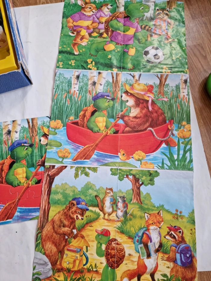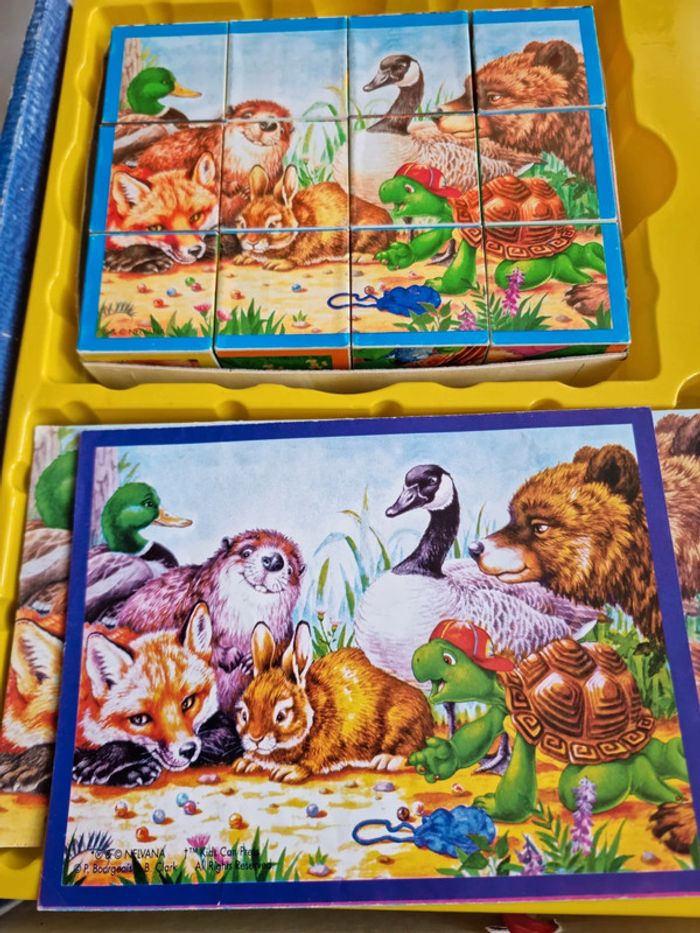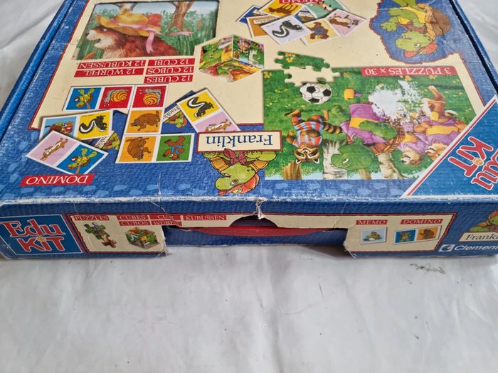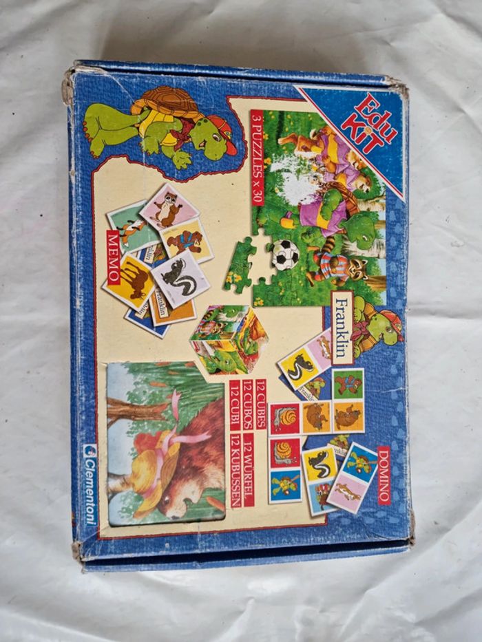 Malette de jeux Franklin EDUKIT de Clementoni Vintage début années 2000 Dès 3 ans 4 jeux réunis dans une malette éducative pour des heures de jeux et d'amusement : des cubes, des dominos, un memory et 3 puzzles sur le thème du célèbre Franklin la tortue. Plein de petits jeux, tous différents les uns les autres, qui permettrons de passer de bons moments avec Franklin et ses amis. Contenus du jeu : Jeu de 9 cubes complet, les posters pour reconstituer plus facilement l'image. Les bords possèdent un cadre de couleur différente pour chaque image afin de faciliter encore plus la résolution du jeu. un jeu de domino de 27 cartes. Le fond uni et les différents animaux permettent de différencier aisément les dessins, pour aider à l'apprentissage du jeu. 3 puzzles 30 pièces, complets, avec posters. Les pièces sont assez grandes et les puzzles assez simples à réaliser. Un jeu de mémory de 48 cartes complet. Le fond uni et les différents animaux permettent de différencier aisément les dessins, pour aider à l'apprentissage du jeu, comme pour le jeu de dominos. En très bon état général. Le jeu a été utilisé mais les cartes restent en très bon état. La boîte est en bon à très bon état. Voir les photos #angel_enfant_jeu_éducatif