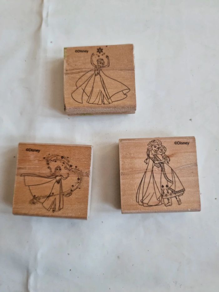 Timbres tampons Disney la reine des neiges Lot contenant 3 timbres tampons tampons en bois. Partie en caoutchouc pour l'encrage du dessin. Age minimum: 36 mois car possède de petites pièces. De 4 à 12 ans environ Il ne restera ensuite plus qu'à colorier ces jolis dessins. En très bon état général. #angel_enfant_jeu_loisircréatif