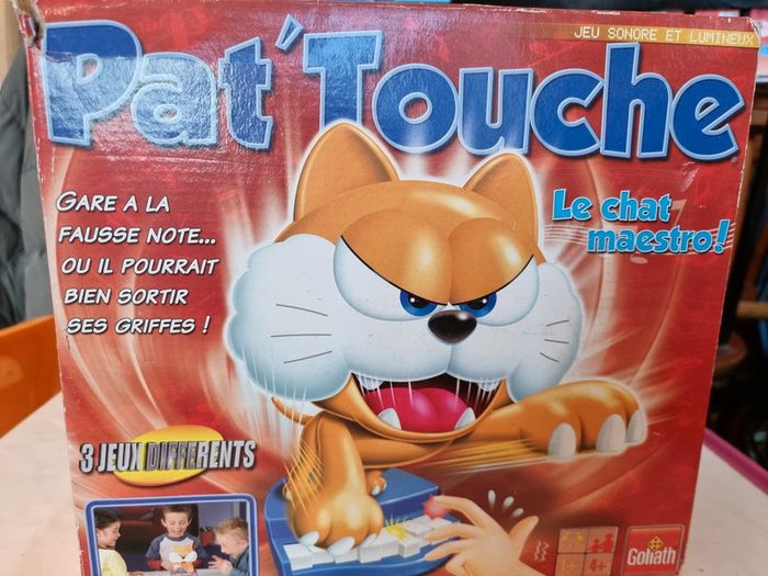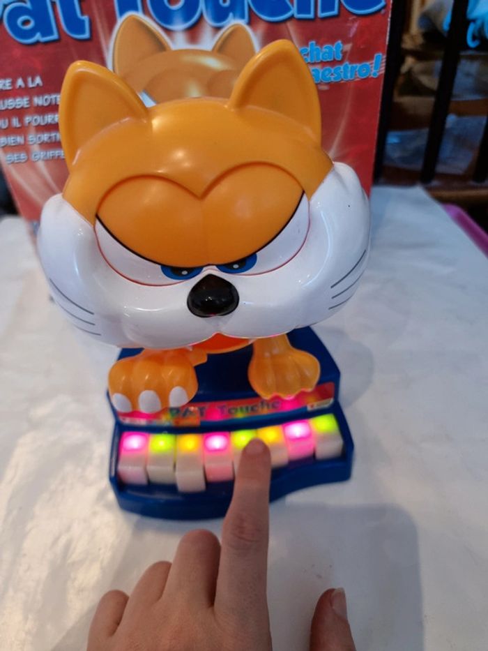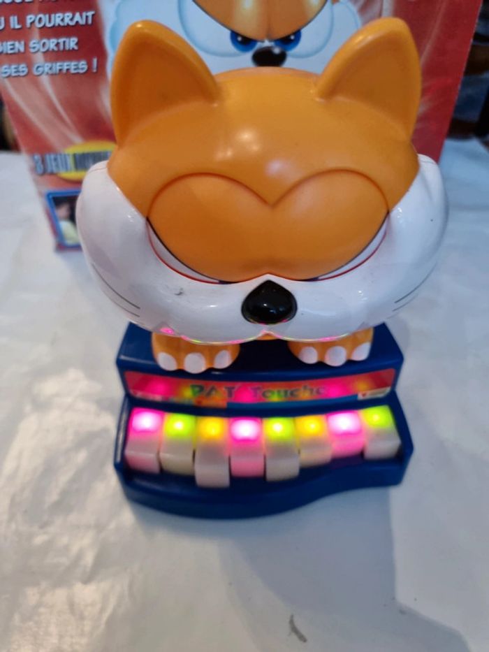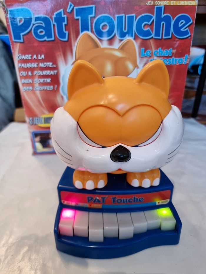 Pat'touche, le chat maestro Goliath Jeu sonore et lumineux. Développe ton oreille musicale avec ce mini piano grâce à 3 jeux amusants : un jeu de hasard, un jeu de répétition identique des notes, un jeu de répétition inverse des notes . Mais attention au chat qui semble dormir, à chaque erreur, il peut sortir ses griffes ! Contient :1 piano-chat Tout fonctionne parfaitement. Voir photos. Jeu en très bon état. Boîte en bon état . Age Minimum:4 ans Nécessite des Piles: 3 de type LR06 AA Pour information prix neuf, 60 euros #angel_enfant_jeu_jeudesociété