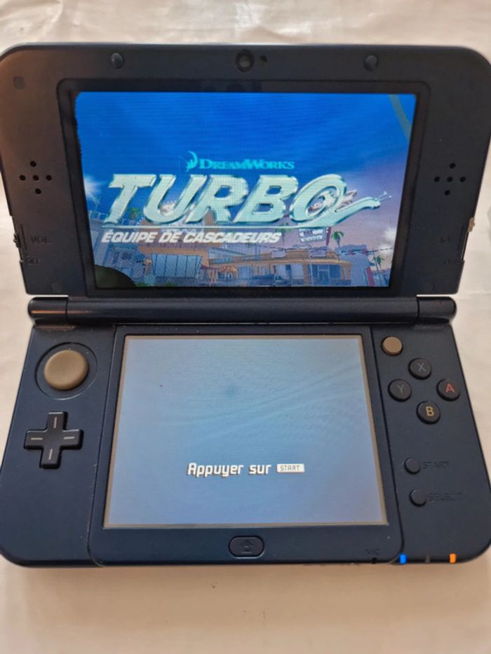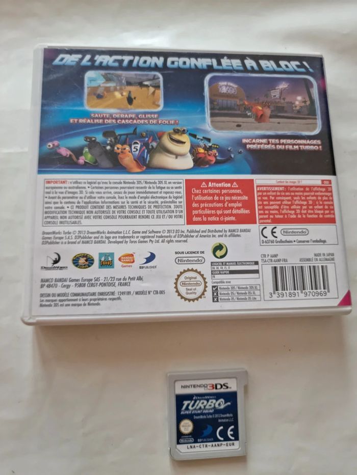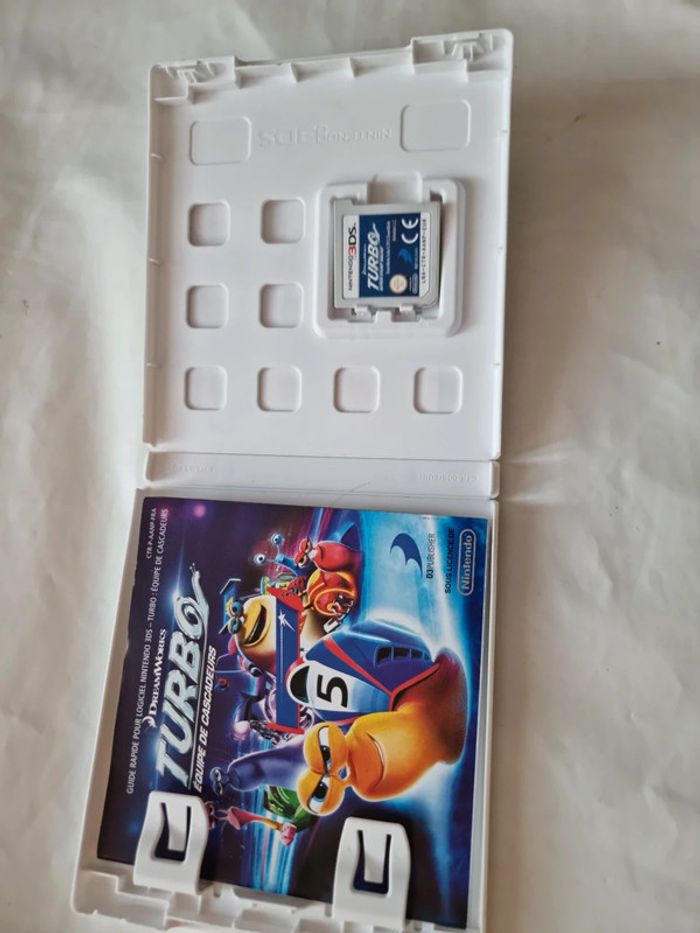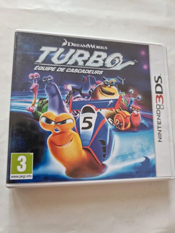 Jeu 3DS turbo équipe de cascadeurs Turbo : Equipe de Cascadeurs est un jeu d’action / course disponible sur la Nintendo 3DS. Contrôlez un des héros du film éponyme, chacun possédant son propre style de pilotage, ses propres figures et compétences spéciales. Vous pouvez customiser votre personnage, trouver des raccourcis sur les circuits, et réaliser de superbes cascades en vous aidant du décor afin de prendre l’avantage en course. Jeu et boîtier en très bon état Jeu fonctionne (voir photos) #angel_enfant_jeu_nintendo