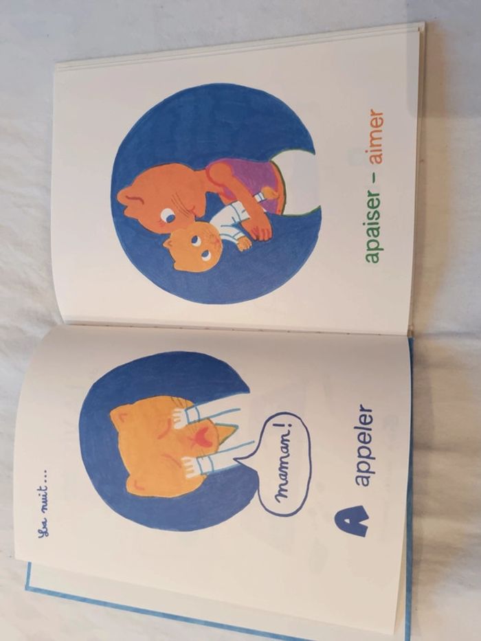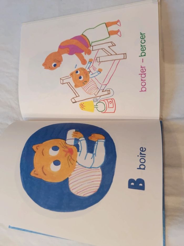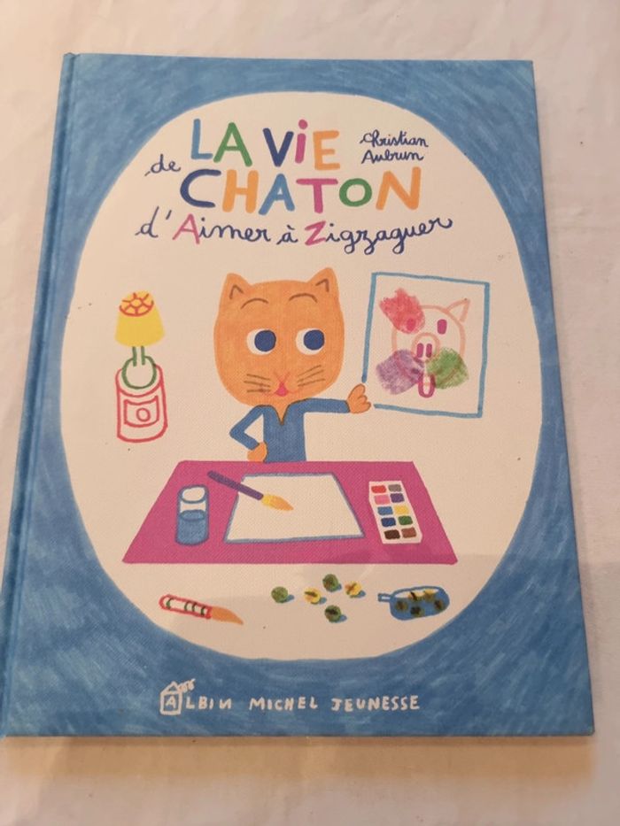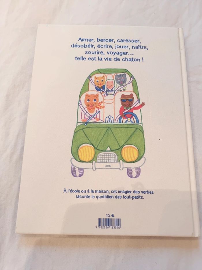 La vie de chaton, d'aimer à zigzaguer Beau et grand livre à offrir. Aimer, bercer, coucher, désobéir, écrire, jouer, naître, sourire, voyager... telle est la vie de chaton ! À l'école ou à la maison, cet imagier de verbes raconte le quotidien des tout-petits, en s'arrêtant sur les moments forts de son existence : les relations familiales, la vie sociale à l'école, la naissance d'une petite soeur, le voyage en famille, etc. Un ou deux verbes suffisent chaque fois à "raconter" la scène illustrée et familiarisent les plus jeunes lecteurs avec le verbe et l'écriture. Dès 4 ans Excellent état #angel_livre_1erâge