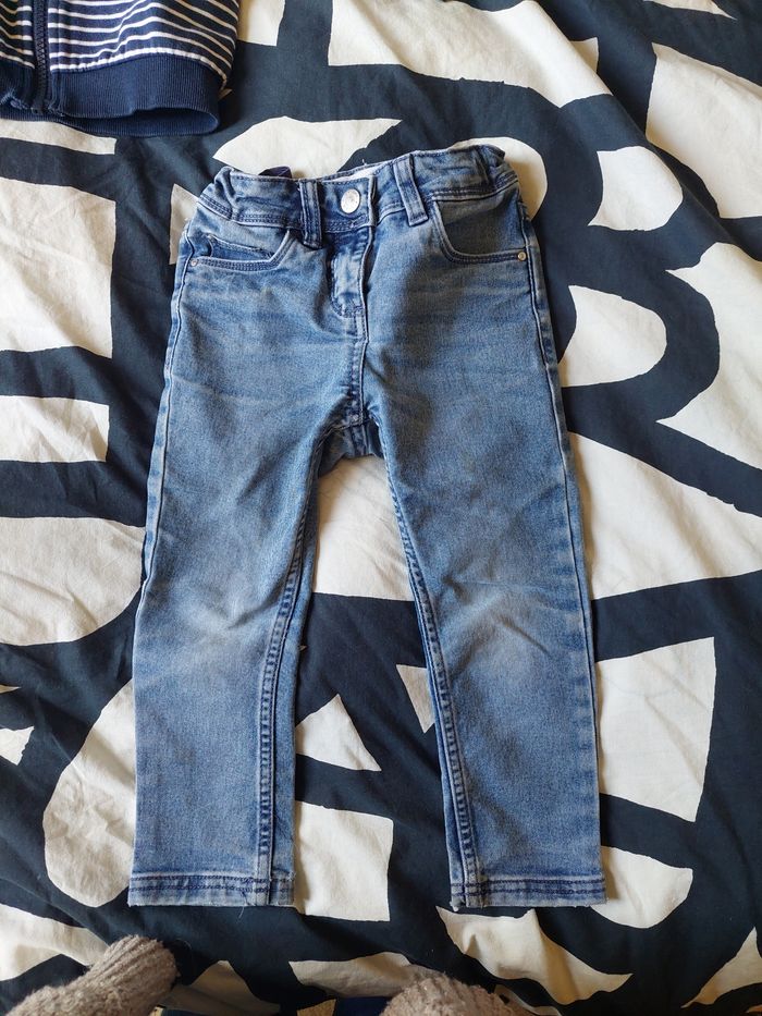 Jean garçon, taille 2/3 ans. Porté, marque usure arrière et genoux et bas. Élastiques de réglage et fermeture en bon état.