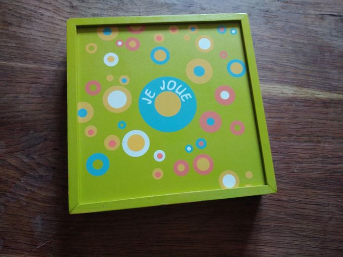 Petite boîte en bois qui ne prend pas de place Celle-ci comprend un jeu de domino, un jeu de morpion et un lot de 5 dés pour jouer à divers jeux...