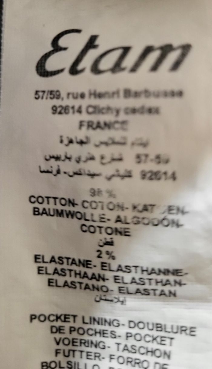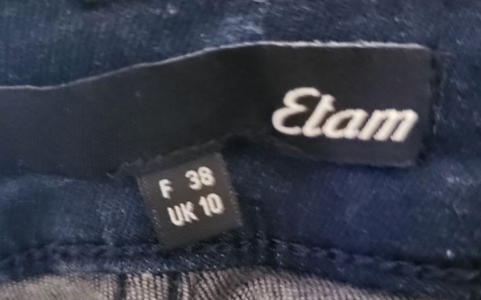 Pantalon Etam bleu marine Taille 38 Mis 1 fois, lavé 2. 98% coton 2% elasthanne 1 leger fil qui est tiré sur le bas Il fait stretch
