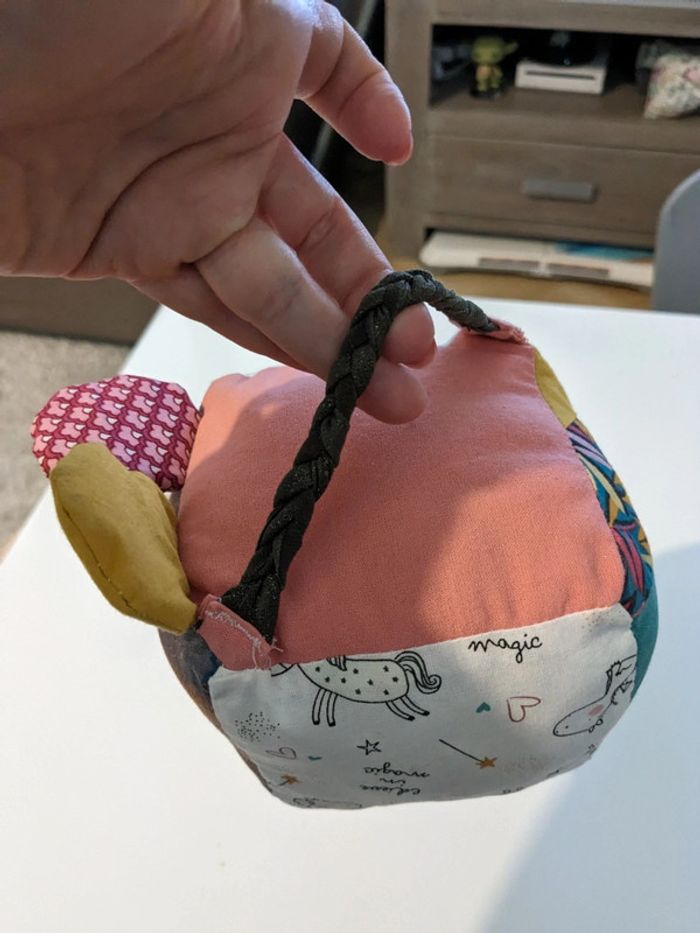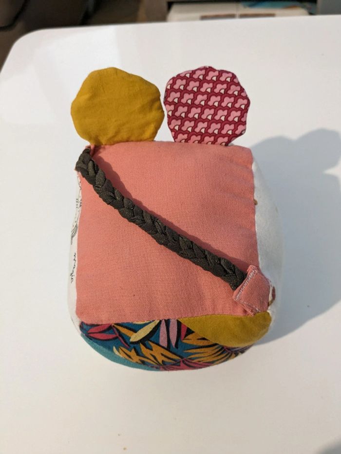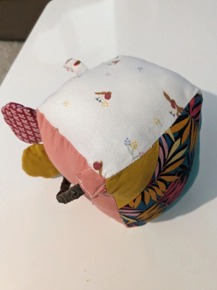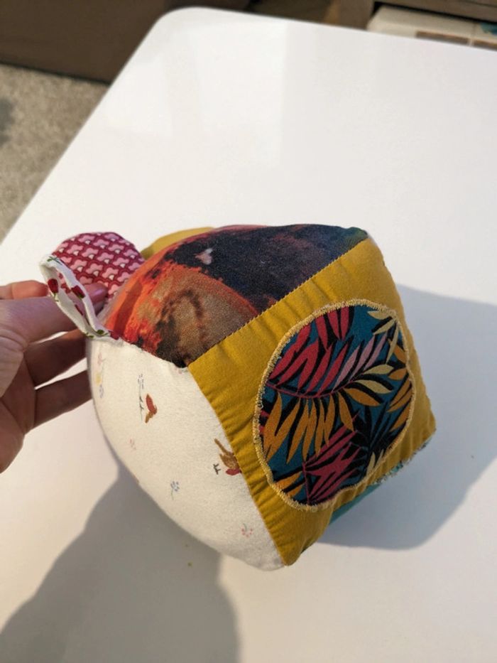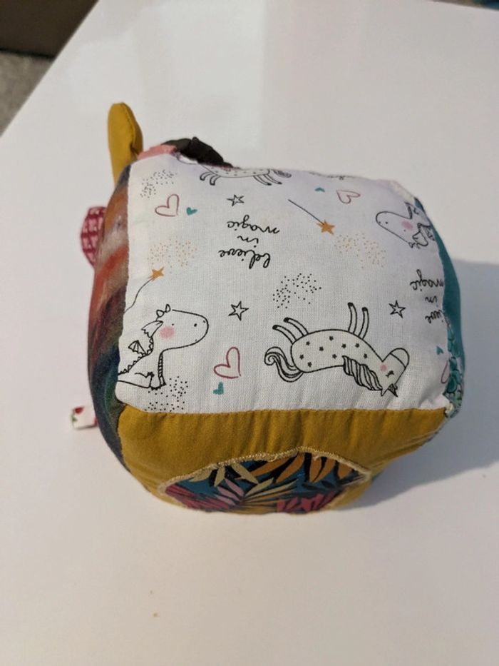 Fait main - cube en mousse avec tissus multicolores, tresse pour attraper et petits bouts de tissu a attraper - pour bébé - comme neuf