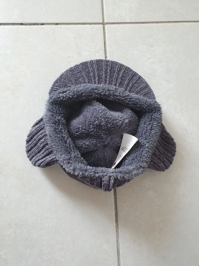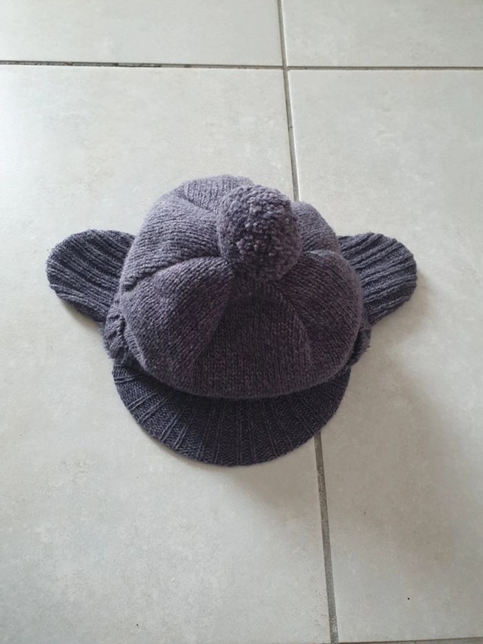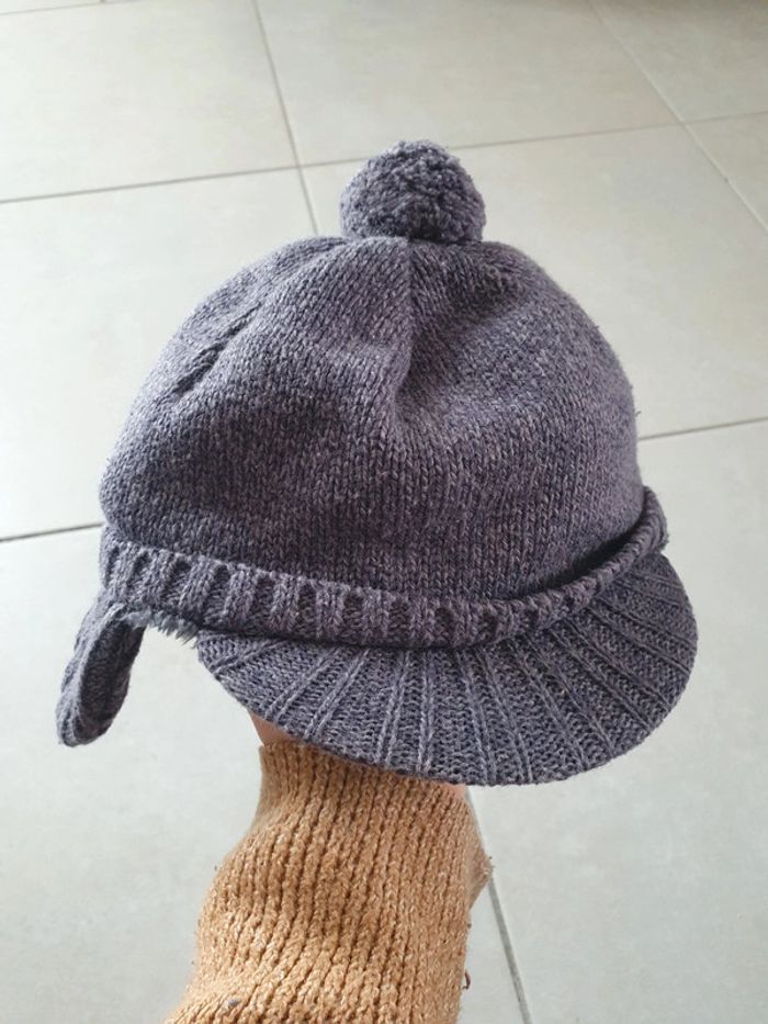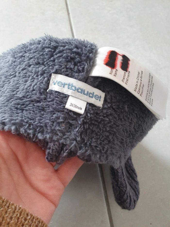 Bonnet enfant 24/36 mois. Quelques bouloches mais seront enlevées avant l'envoi. Du feutre pour cacher le prénom mais vous pouvez remettre une étiquette par dessus sans problème. #bonnet #vertbaudet #gris #enfant
