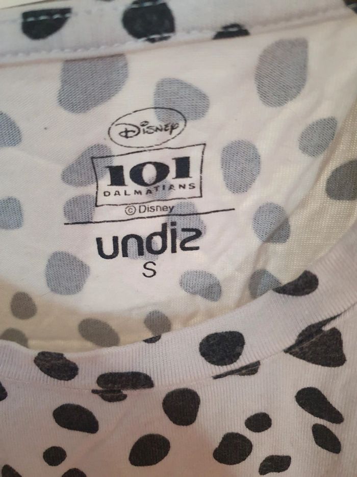 T-shirt Cruella en taille S, Undiz. Une ou deux petites tâches noir clair mais ça ne se voit presque pas vu le t-shirt. Je n'ai pas essayé de détacher mais ça pourrait peut-être partir (voir photo). Un petit fil est un peu abîmé aussi (voir photo). #cruella #disney #undiz #tshirt