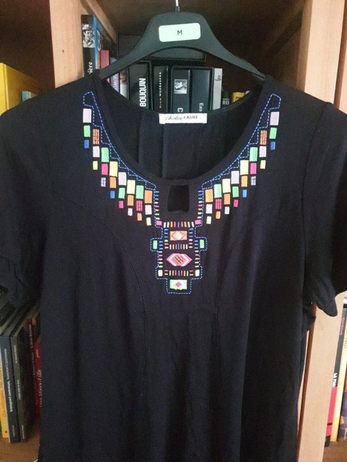 Neuve jamais portée. Longue et évasée En viscose/ élasthanne Taille 3. Fonds noir. Broderies multicolores