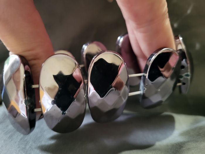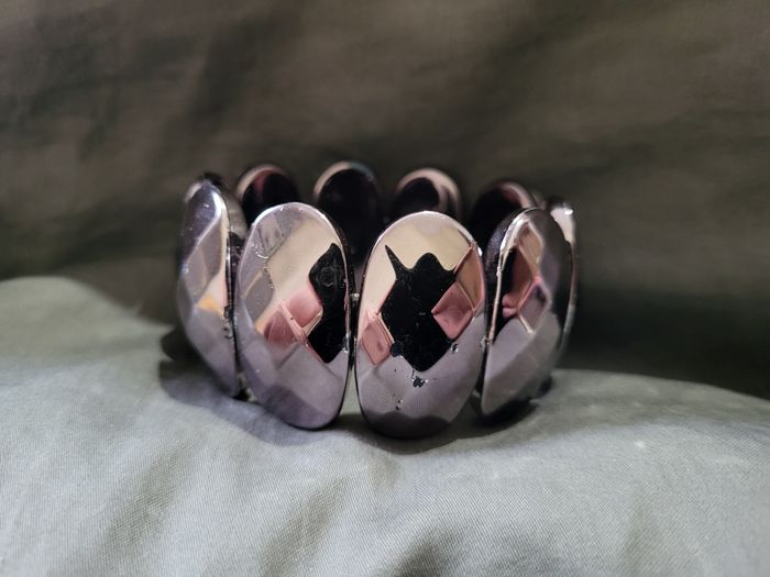 Bracelet en plastique élastique Je dirais gris brillant, mais je suis un peu daltonienne lol... Jamais mis mais il manque de la peinture à des endroits, et légèrement rayé du au stockage