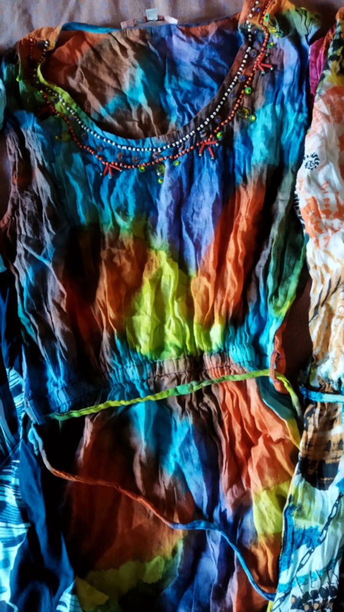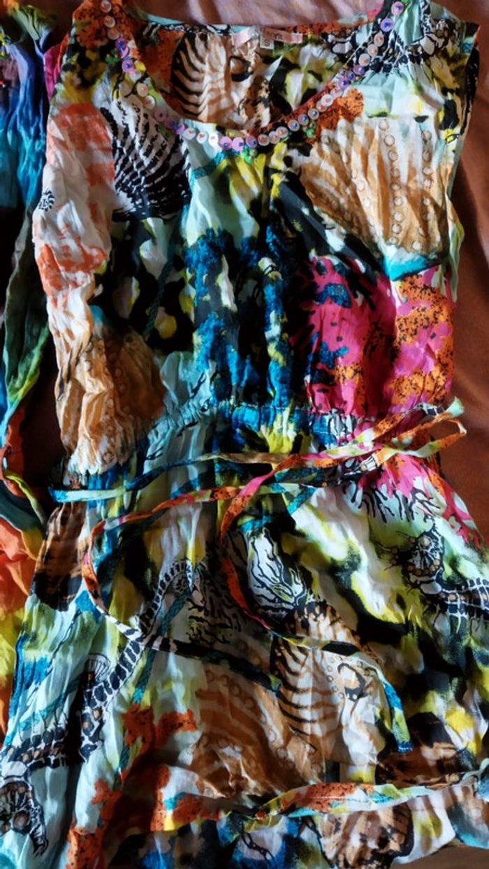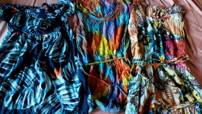 Lot de 2 tuniques sans manches très colorées en taille S mais correspond à un XS car serrantes et une robe bustier sans bretelles en XS. Le tout en très bon état