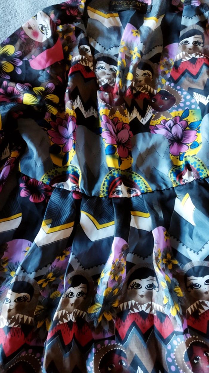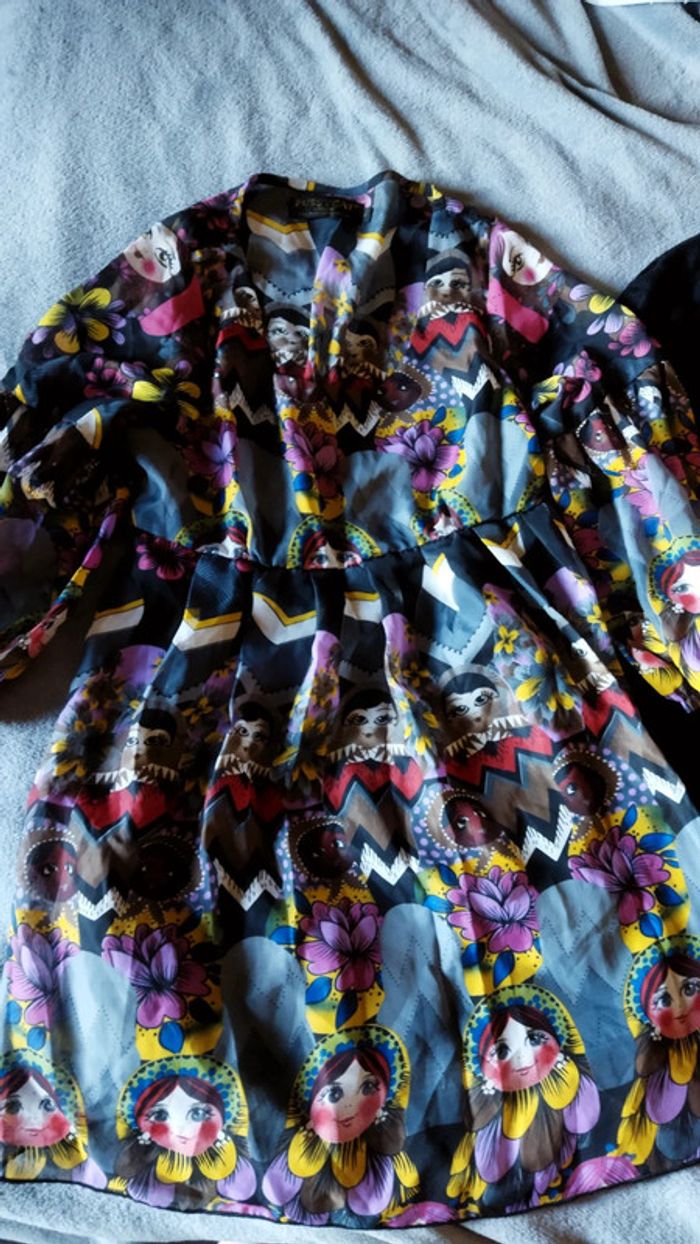 Jolie blouse voile transparent imprimé matriochka doublé jamais portée. Avec je donne un gilet noir manches 3/4