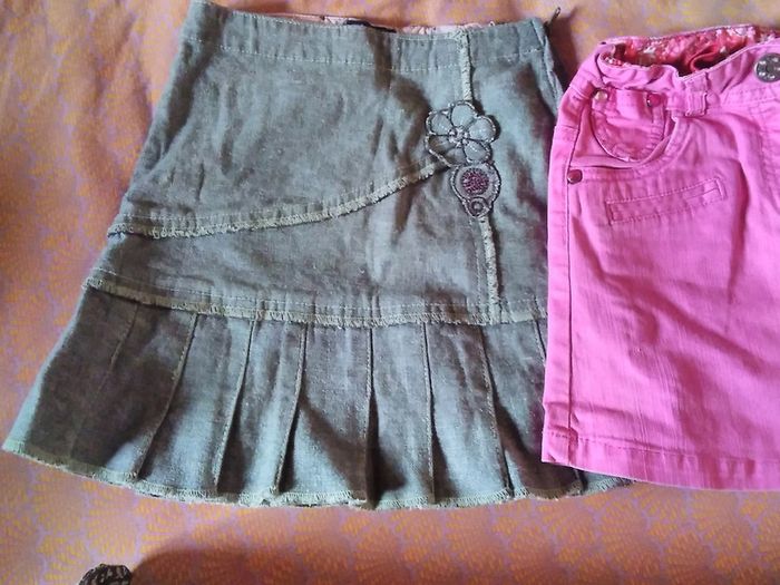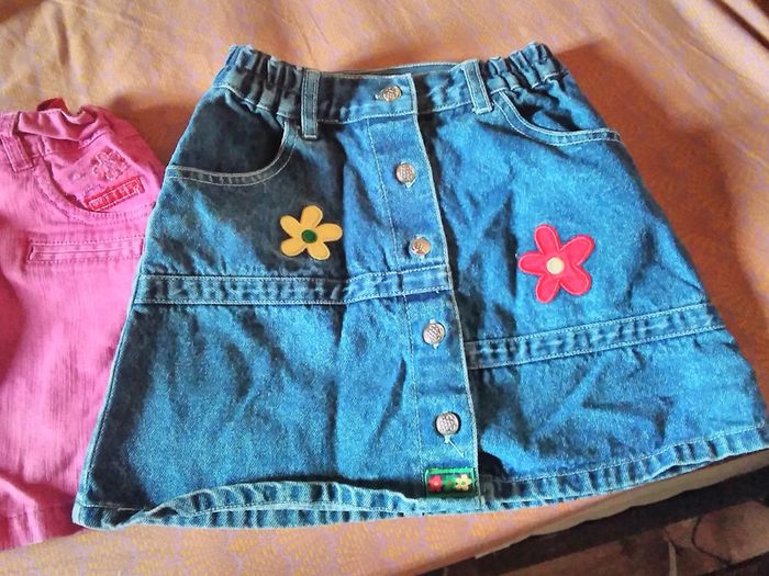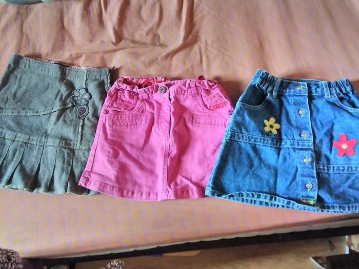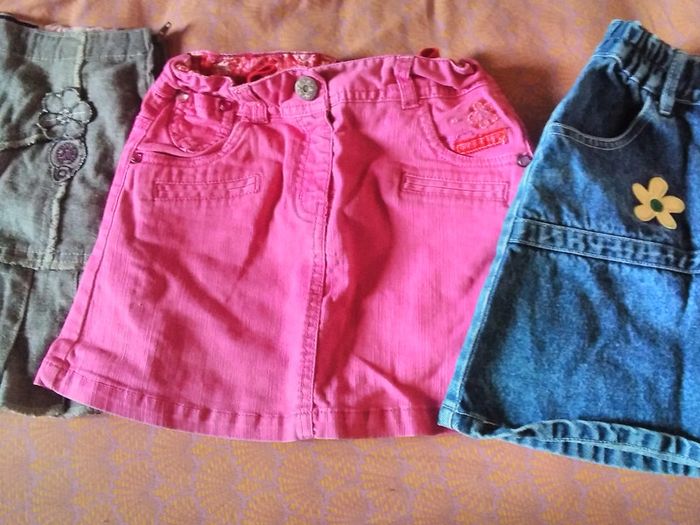 Lot de 3 jupes en bon état 1 jean a fleurs en 5 ans mais taille grand 1 rose stretch 7 ans mais plutôt pour 6 ans 1 genre jean gris étiquette mais taille similaire aux autres
