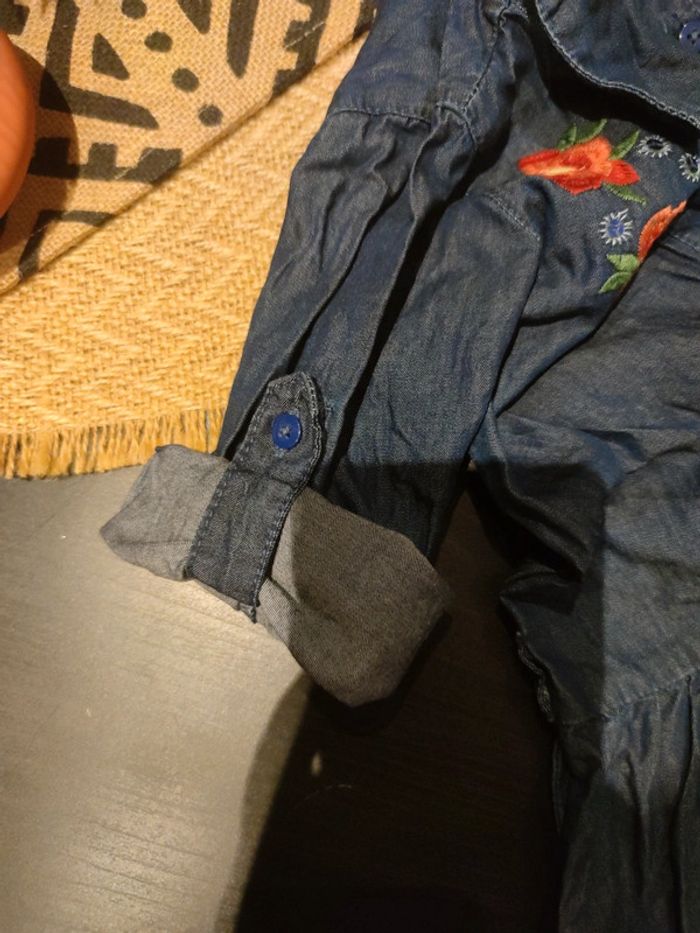 Robe effet jean avec broderies fleurs, taille 23 mois, en très bon état, peu porté, possibilité de remonter les manche et les fixer avec une languette et un bouton, fermeture par boutons à l'avant, passant ceinture (manque ceinture d'origine)